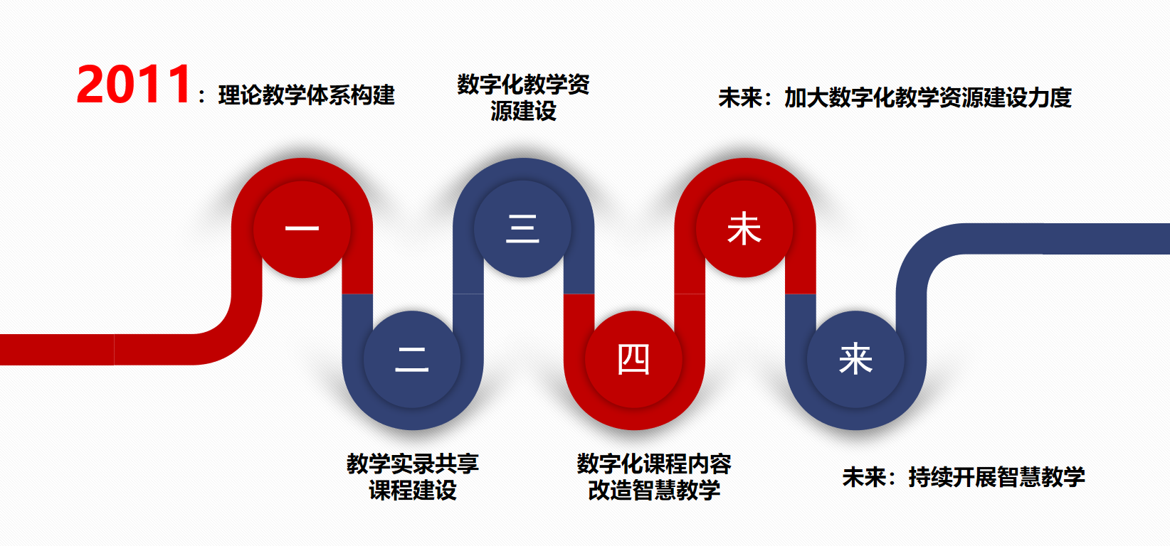 2011年开始课程建设,13年建设期经历了理论教学体系构建-教学实录共享课程建设-数字化教学资源建设-数字化课程内容改造智慧教学四阶段。