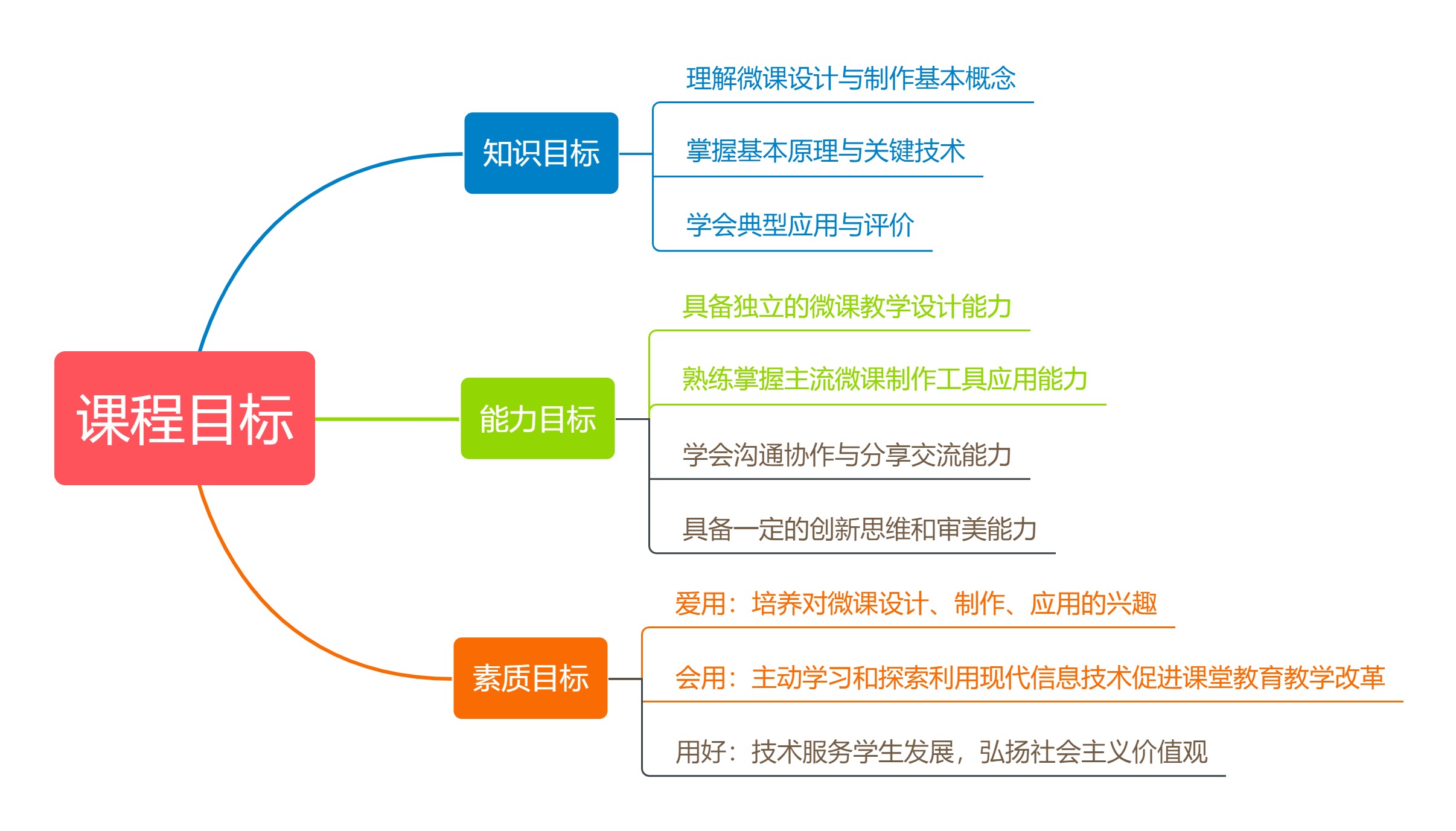 在知识目标方面,使学生能够理解微课设计与制作基本概念、基本原理、关键技术,掌握典型的微课应用与评价方法。