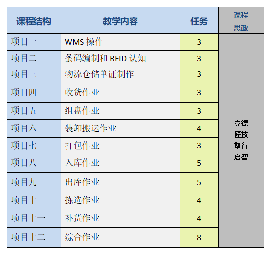 教学组织与实施采用“任务驱动,一主两辅,二融、三段、五步”教学方式打造“四有”课堂,即以实际工作任务为驱动,以学生为主,专任教师及实训指导教师为辅,学生的工作过程与学习过程相结合,通过学、做、评三阶段的实践训练,通过析(分析工作任务)、明(明确工作角色)、固(巩固理论知识)、练(训练专业技能)、强(强化综合素质)五个进阶的环节,建设有用、有趣、有料、有效的“四有”课堂,从“立德、匠技、塑行、启智”四个维度开展课程思政,让学生具备物流职业人的专业能力和职业素养。