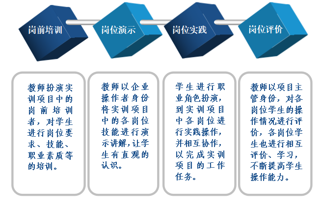 课程依托校内实训基地,采用“企业环境、真实岗位、职业角色”全真实践教学模式。以综合职业素质培养为宗旨,以职业能力培养为主线,以实践技能训练为重点,以就业为导向,以培养高素质技能型人才为目标,创新采用“企业环境、真实岗位、职业角色”的全真实践教学模式。