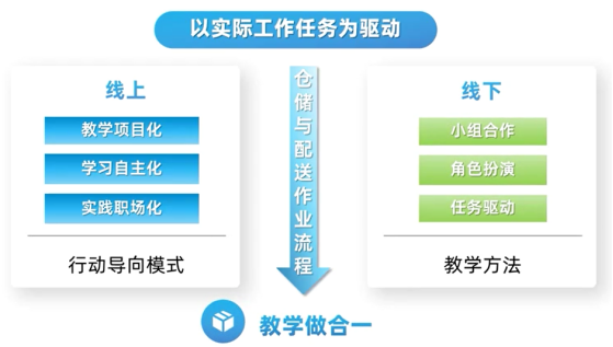 课程以仓储与配送作业流程为主线,以实际工作任务为驱动,采用线上线下结合的混合式教学,采用“教学项目化、学习自主化、实践职场化”的行动导向模式和小组合作、角色扮演、任务驱动等教学方法,做到教学做合一。