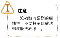 纯硫酸是一种无色无味的油状液体。浓硫酸是指浓度(这里的浓度是指硫酸的水溶液中纯硫酸的质量分数)大于或等于70%的硫酸溶液。常用的浓硫酸中H2SO4的质量分数为98%,其密度为1.84g•cm-3。硫酸是一种高沸点难挥发的强酸,易溶于水,与水能以任意比例混溶,浓硫酸溶解于水时放出大量的热。浓硫酸有强烈的腐蚀性,它能夺取纸张、木材、布料、皮肤里的水分,生成黑色的炭。所以使用浓硫酸时应十分小心。