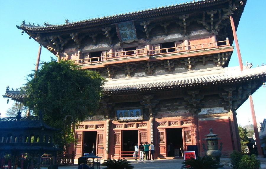 进入山门,恰巧将视线集中点凝聚在后檐当心,把观音阁这一主体建筑纳入视角。山门采用分心斗拱、底槽殿堂的木结构架。面阔3间,16.16m;进深4架椽,8.62m;单檐4顶。两次间用木柱间隔分设造像。中柱安装双扇板门,空间紧凑。不设天花板,斗拱和托脚等木构件裸露可见,装饰室内,显现清晰木材的结构逻辑关系,设计效果朴实无华。标准用材24×17㎝,相当于3等材。椽条长达10材,都是当时所允许的最大值,显现出壮大的尺寸感。山门台基低矮,屋身板门,直棂窗古朴简洁,斗拱雄壮,出檐深远,房脊兽造型遒劲,使整体建筑形象雄伟壮观。