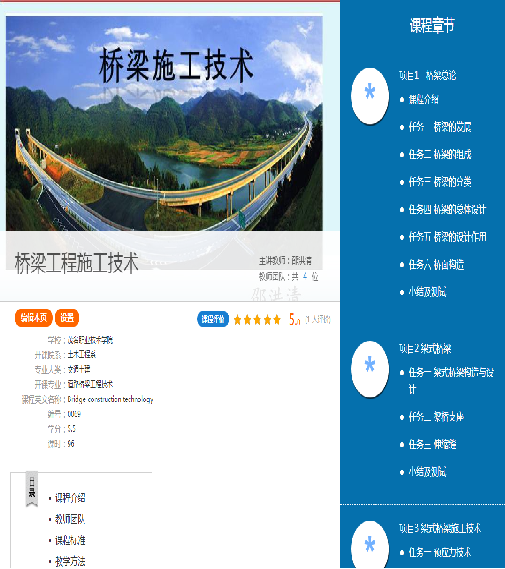 本课程执行最新行业标准和规范,工学结合,工程案例典型,富有学习性,学习资源丰富,易懂好学。学习本课程旨在培养学生良好爱国情怀,认真细致严谨科学的工程态度、刻苦认真的工匠精神,对职业的热爱,为交通事业奉献的使命感的职业道德能力,桥梁的设计能力、施工测量技术能力,通过课程工作任务项目驱动进行独立实训实操、生产实习,后继课程的学习及能力训练,实现“工程勘察与桥梁设计能力、材料试验与检测能力、道桥工程施工与组织能力、质量验收与评定能力”等核心能力的培养。