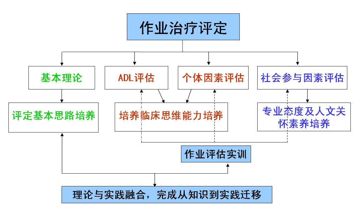 课程总目标:通过本课程学习,使学生完成从知识继承者到知识创造者的转变,使其思维敏捷、善于思考,能够解决实际问题,使学生的知识和能力在想象中不断发展,让学生逐步养成作业治疗思维的习惯。知识目标:①理解作业治疗评定的目的和意义;②掌握作业治疗评估理论与常见领域评估方法;③掌握作业治疗评定流程;④掌握作业治疗评估结果分析知识及运用指导作业治疗方案的形成。技能目标:①正确全面收集治疗对象资料;②具备临床推理思维选择正确合适的评估工具;③准确无误地按照标准操作步骤实施评估,包括评估工具的具体操作,评估流程的实施等;独立分析已有资料拟定治疗目标、确定治疗重点。态度目标:①培养规范操作的专业态度;②培养评估过程中的人文关怀理念;③培养科研意识与循证思想。