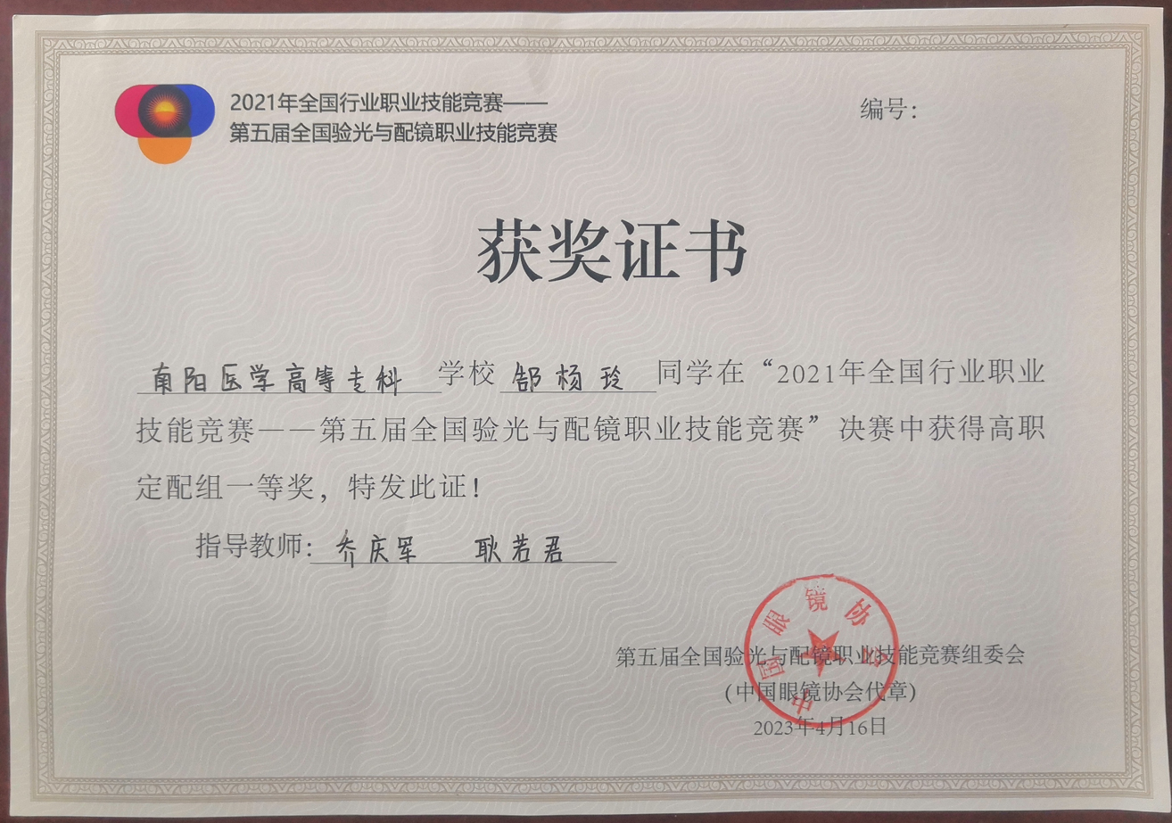 图2学生获得的全国眼镜定配竞赛一等奖证书