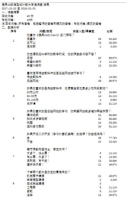 利用在线平台上的问卷调查功能,对2016级模具设计与制造专业学生发起了本课程教学情况的问卷调查,回收有效问卷45份,如图12所示。在学生反馈中,主要有以下几点: