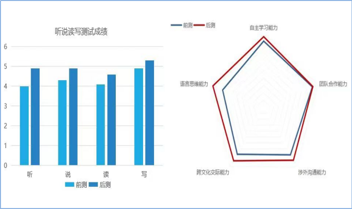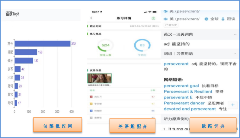 自主学习完善目标:具有明确的英语学习目标,能够有效规划学习时间和学习任务,运用恰当的英语学习策略,制定学习计划,选择学习资源,监控学习过程,评价学习效果。为有效解决教学的重难点,达成教学目标,团队在“同胚变换”思想指导下,搭建多种“脚手架”,引导学生不断自主探索。针对学生应用文写作的教学难点,利用句酷批改网分析错误,在用词、搭配、格式等方面指导。学生根据网站评价自行纠正错误,激发其探索句型的积极性。针对英语听说的教学难点,解决学生开口难的现状,采用英语趣配音软件反复进行听说训练,激发学生英语学习兴趣,培养在英语环境下的表达能力和沟通能力,提升英语学习效果。针对学生发音不标准的教学现状,利用欧路词典查询原声例句,鼓励学生反复跟读,课堂展示高分学生,鼓励学生互相比拼学习。