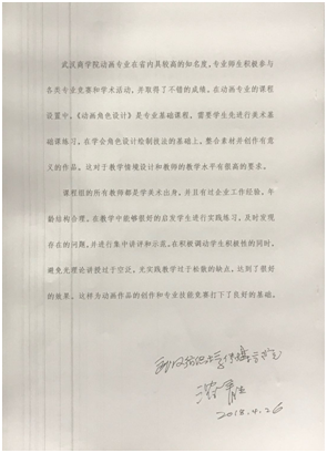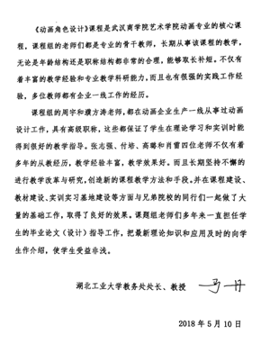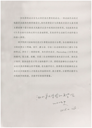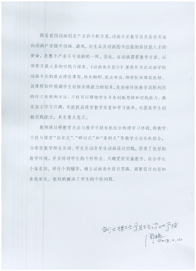 《动画角色设计》是动画专业的核心课程,老师在教学过程中重难点把握准确,教学内容主次分明,能抓住关键。老师的教学效果好,使我们在学习新知识的同时提高自己的实践能力。而且教学内容广大博深,高质量,高效率。老师的专业基础技能高深,非常注重学生的专业动手技能的培养。课堂内容新颖,独特,有个性。老师在课堂上表现出来的激情和精神都深深地吸引并打动着我们,希望我们的老师能够继续创新,把这门课程打造成精品课程。