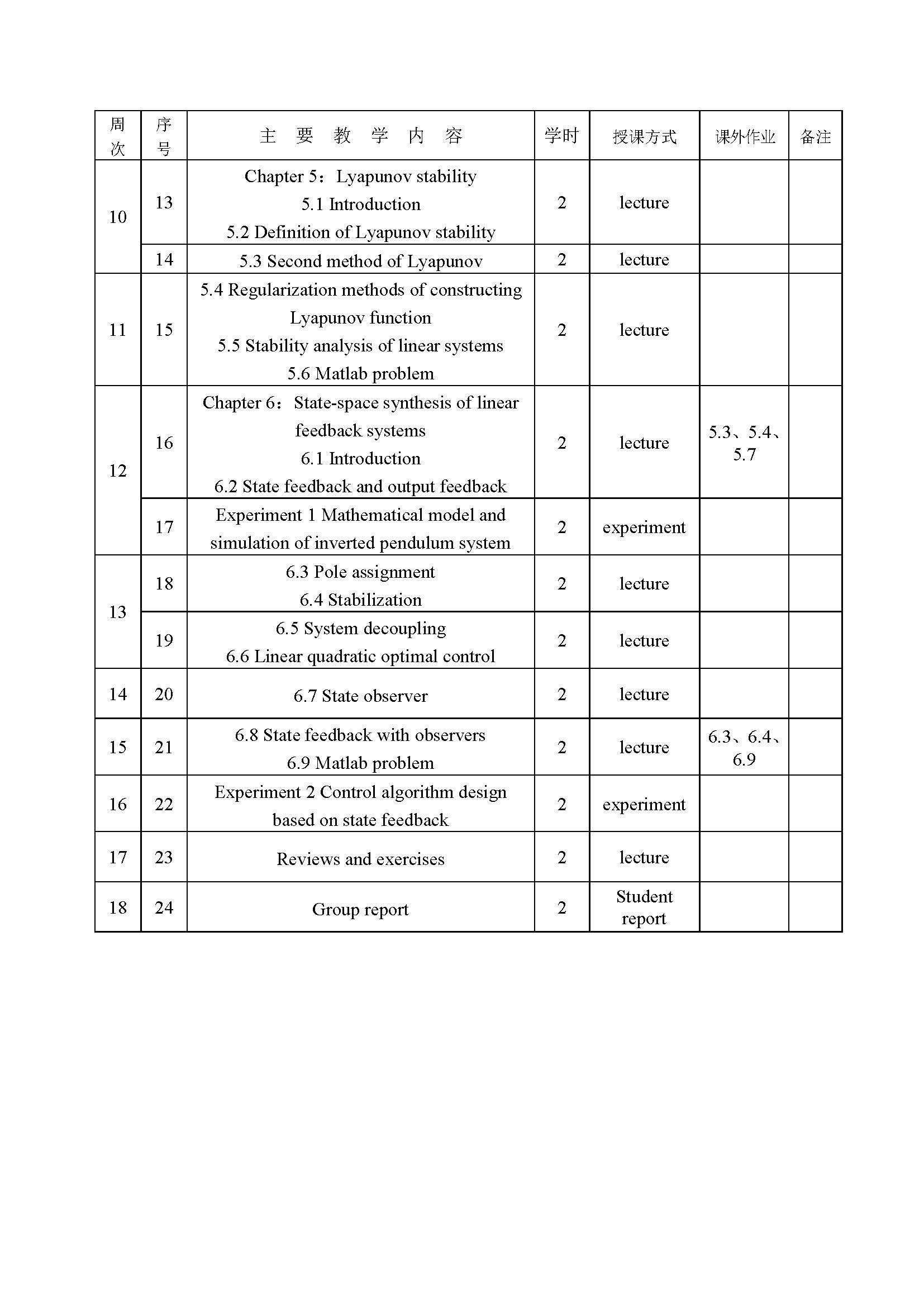 Through the study of this curricula, we hope that students can correctly establish the mathematical model of all kinds of typical systems, especially the state space model, grasp the analysis method of various system models, and apply state feedback, pole assignment and state observer methods for synthesis and design of complex systems. Finally, students have the ability to engage in control system analysis and research.