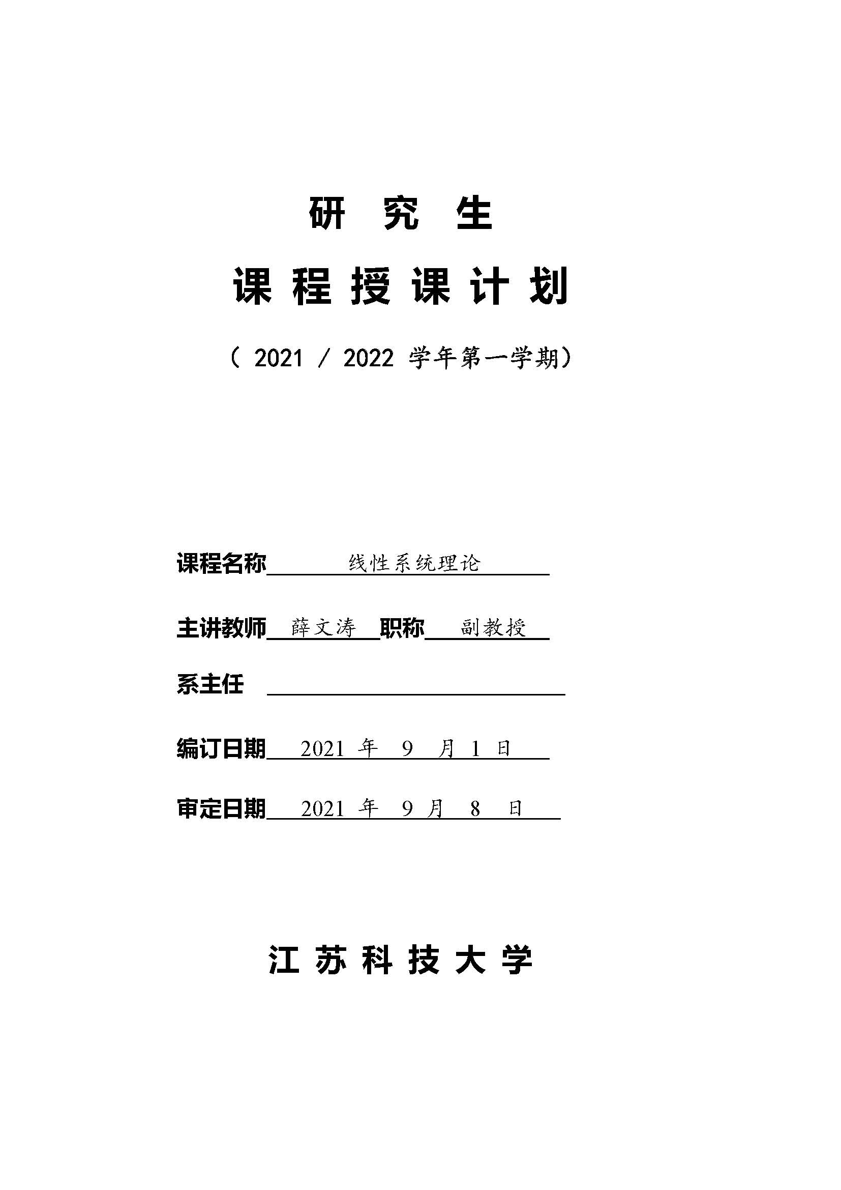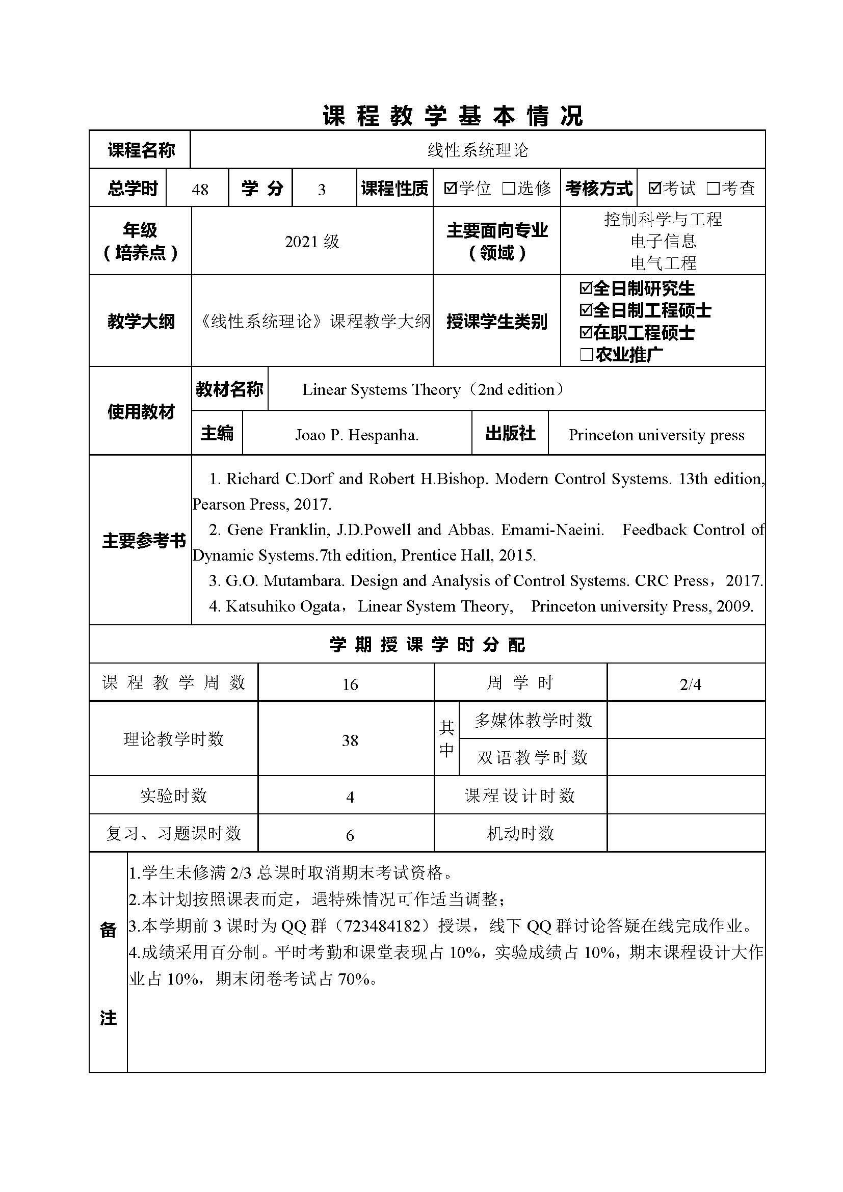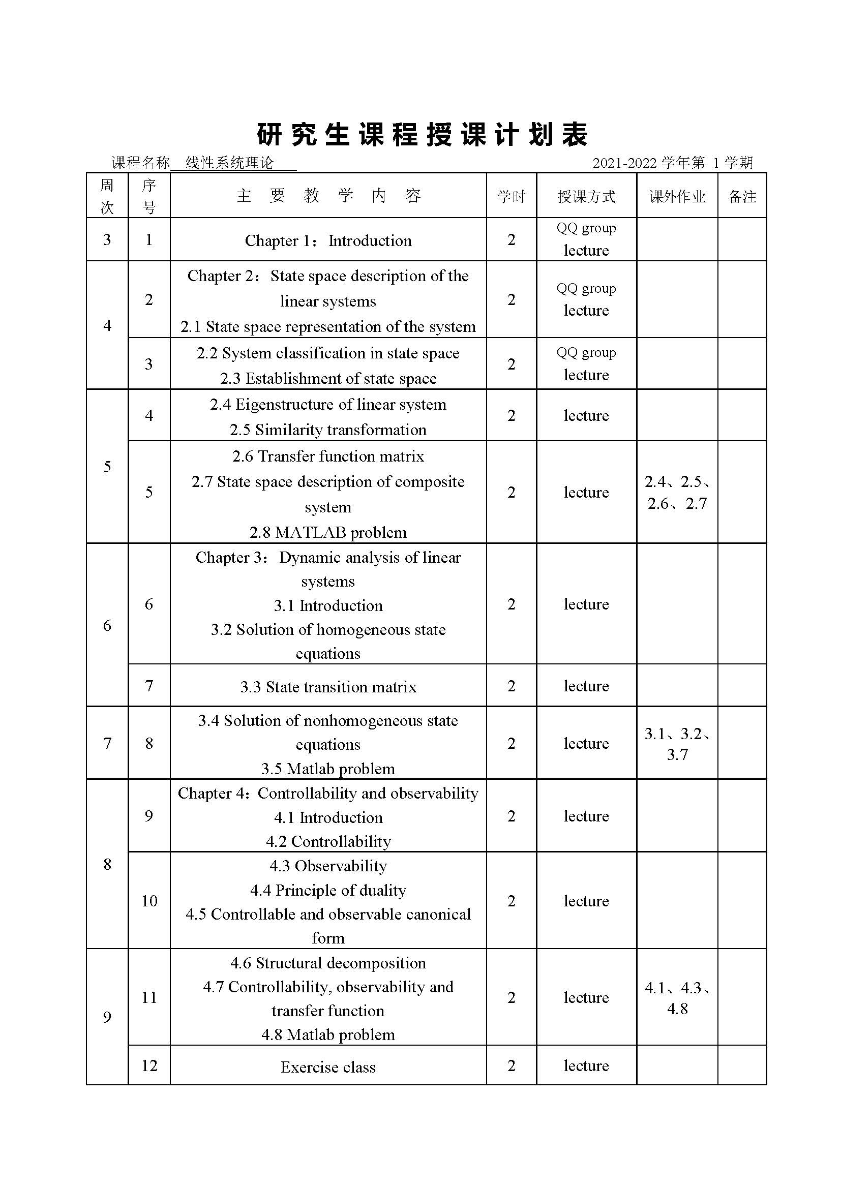 “线性系统理论”是控制科学与工程学科的一门学位基础课程,本门课程对于学习控制理论的许多学科分支,如最优控制、系统辨识、鲁棒控制、智能控制等具有重要的作用,同时,该理论也对广泛应用于工业、农业、船舶、航空航天等诸多领域。