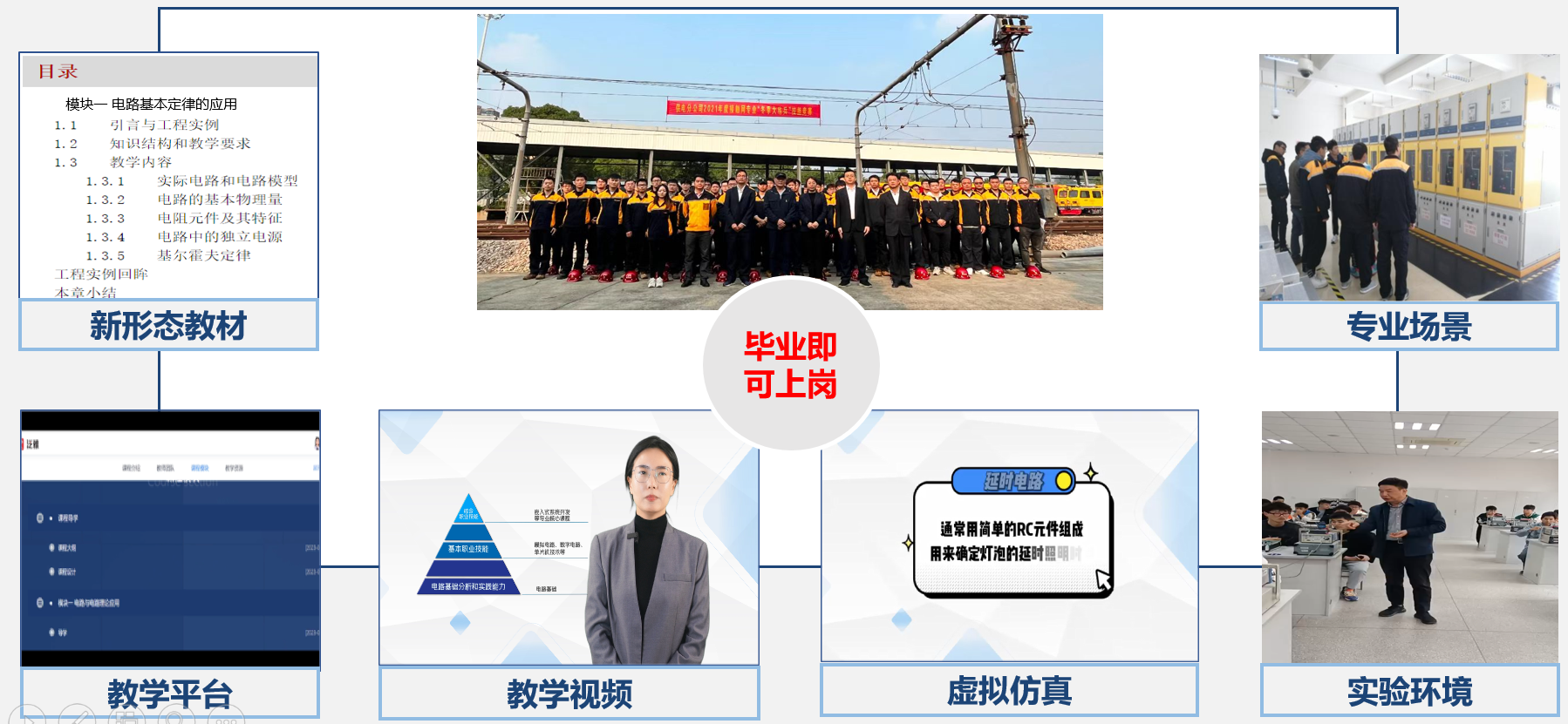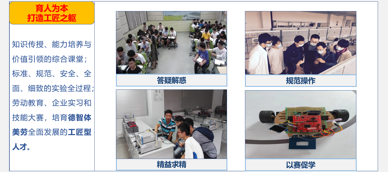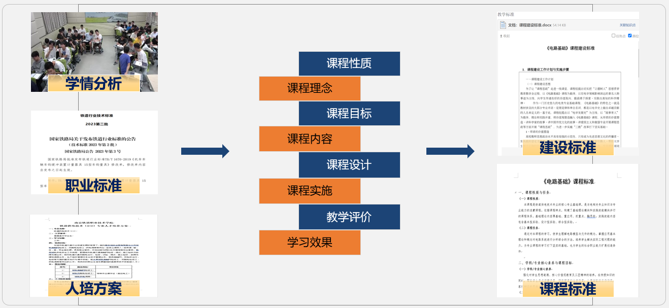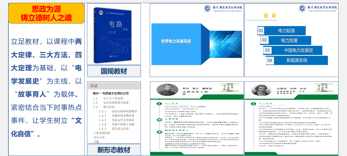 课程定位:高职本科分段培养的核心专业基础课,电类专业知识、专业能力以及专业素养培养的启蒙课程。 教学对象:铁道供电技术专业/电类专业学生。 课程特点:本课程本课程具有理论实践性强,公式多,计算量大等这样一些特点。主要通过现象→原理→应用三个过程的学习和实践,培养学生的自主学习能力、实践创新能力和精益求精的工匠精神。课程特色是以“电学发展史”为主线,以“故事育人”为载体,理论、实践和素养并重,将 价值观塑造融入课程,从师者的价值塑造、讲科学家的故事、讲中国传统文化的故事、讲爱国主义和做强专业方面开展“课程思政”,切实把“思政为源”、“ 师德为范”、“ 育人为本”和“学生为主”的思想贯穿教育教学全过程,为进一步实施“三教”改革打下坚实基础。 培养目标:以学生生活经验中的电路常识为切入,以电路原理和电路系统为内容,以轨道行业供电应用为导向,以培养职业能力为核心。通过现象→原理→应用三个过程的学习和实践,使学生理解电路模型的概念,掌握应用基本理论和概念对电路系统进行综合分析的方法,培养学生解决工程实际问题的能力。