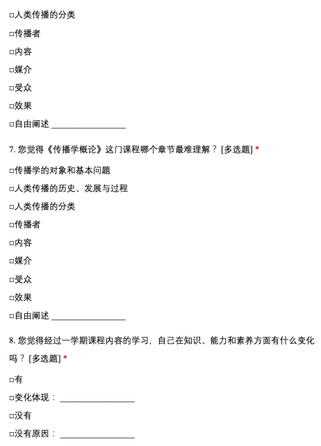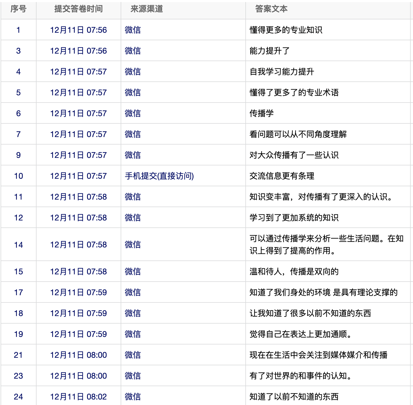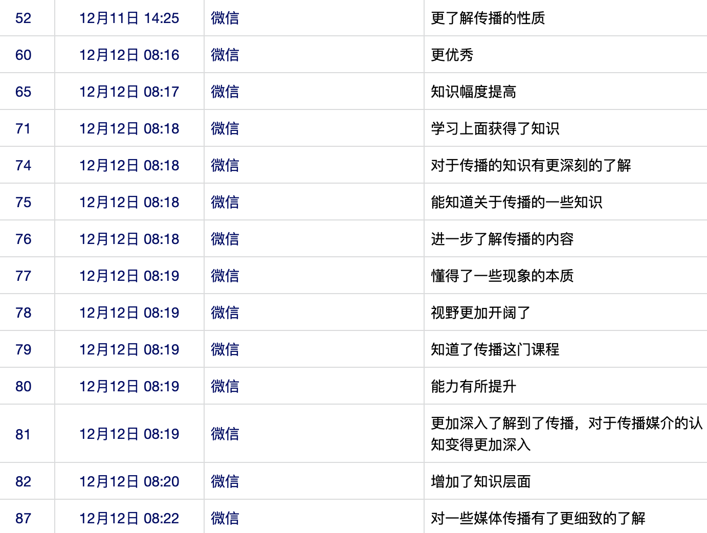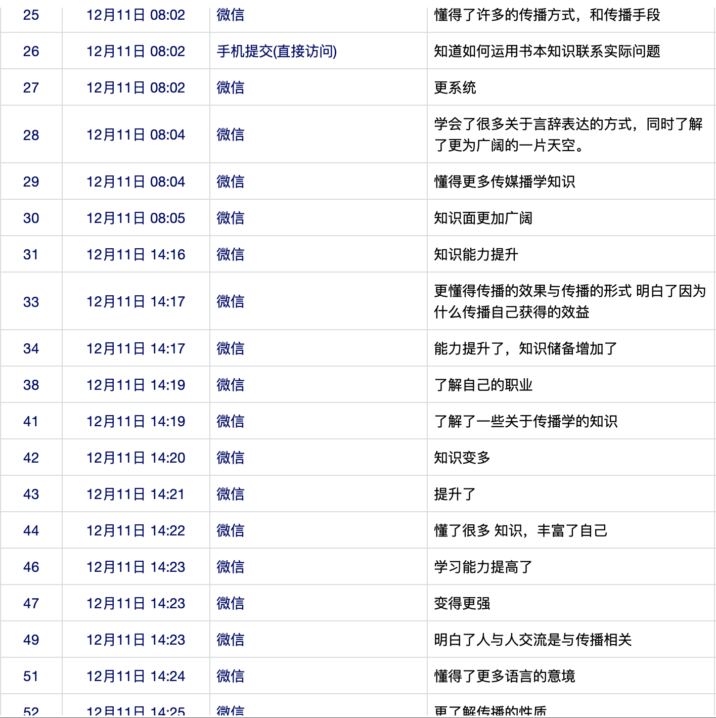 通过本课程学习,使学生对传播学这一新兴学科的总体框架有大致的认识;对传播学的发展脉络有基本的了解,并能够对其中的一些重要问题进行思考。同时,逐步从传播学理论的角度分析现实生活中的传播显现,提高学习者自身的媒介素养能力。通过问卷星调查学生学习情况,反馈如下:
