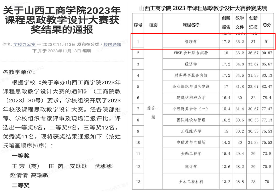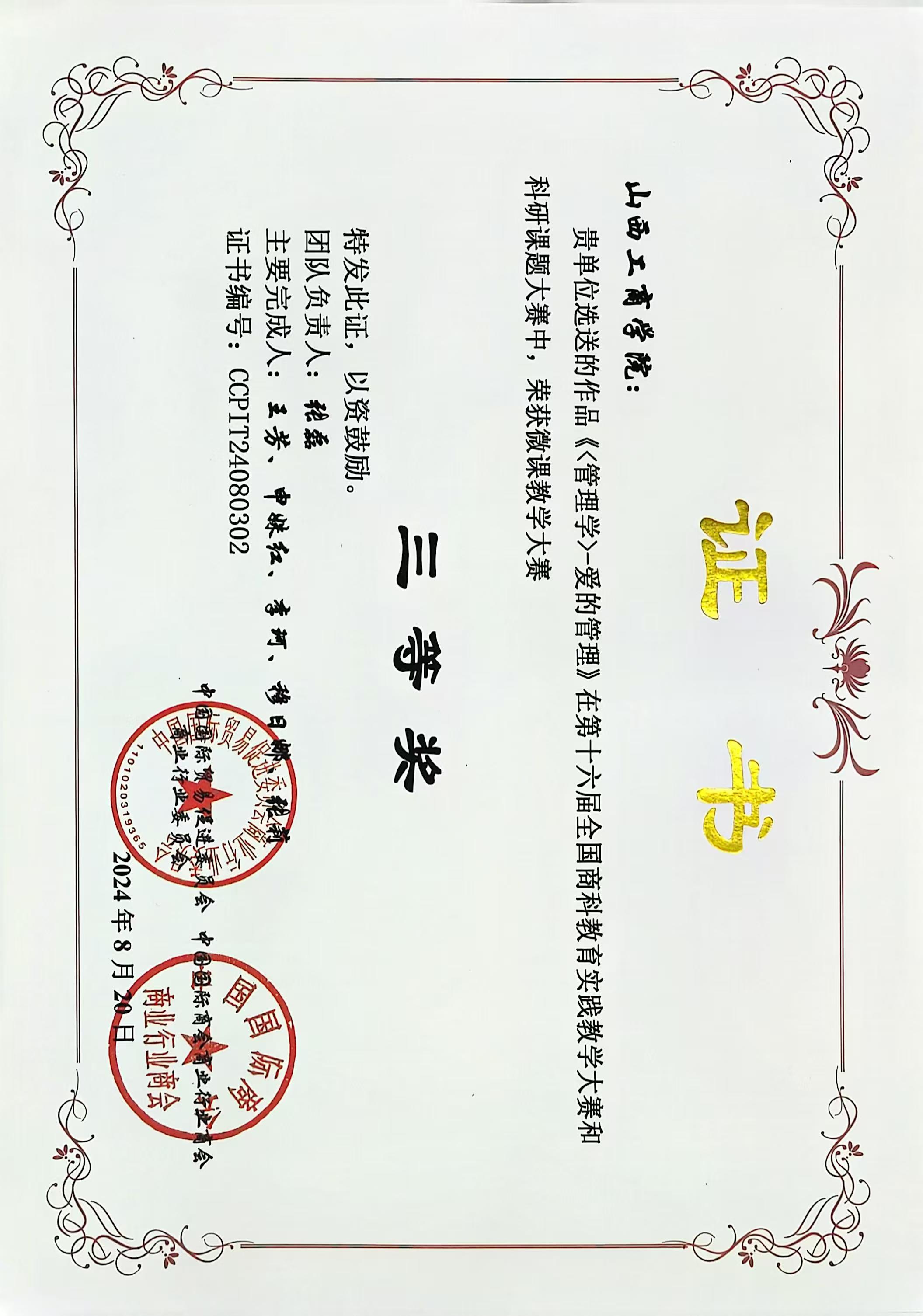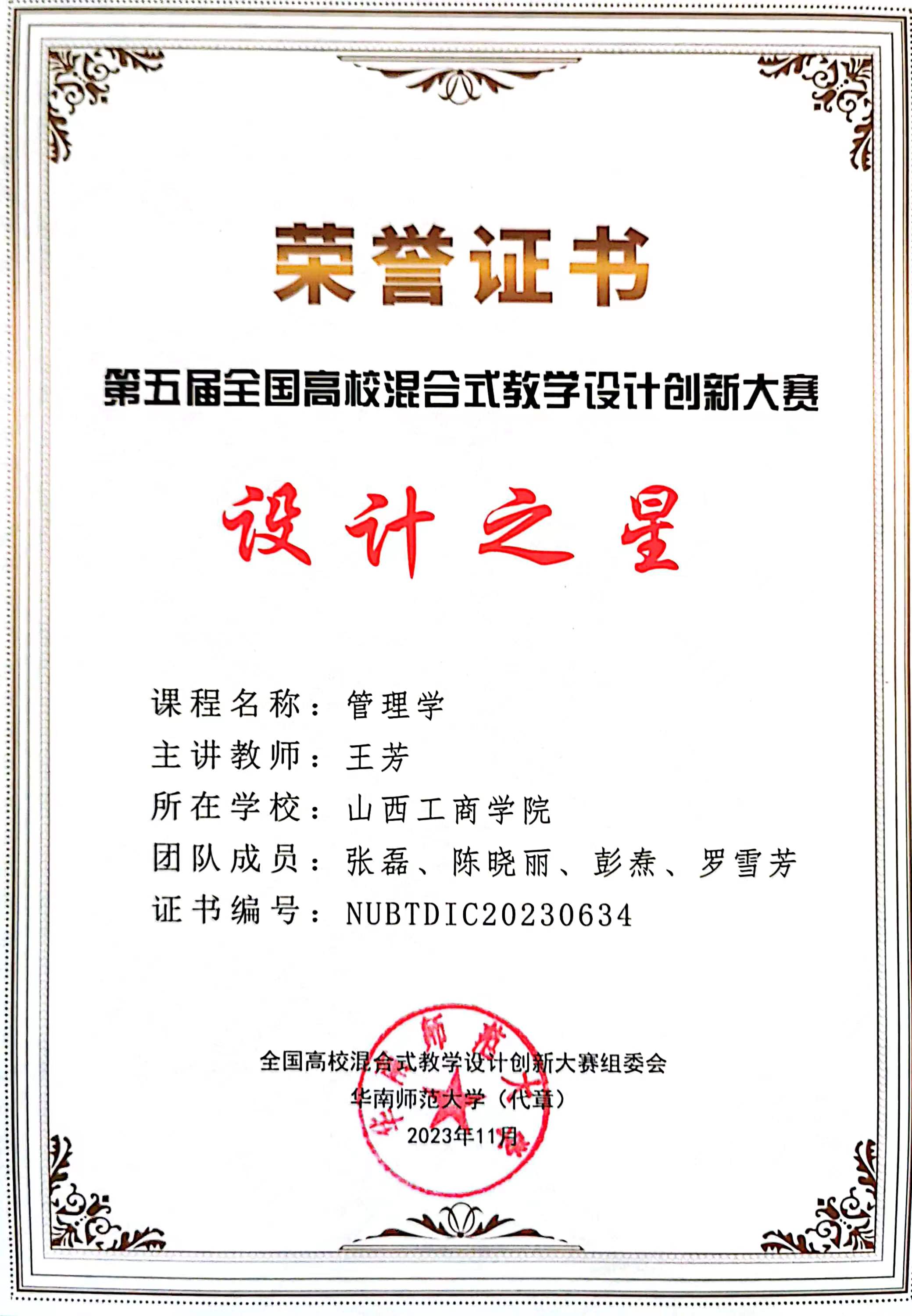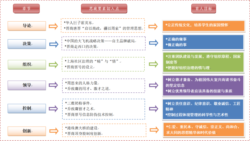 《管理学》课程主要面向工商管理、人力资源管理、市场营销、财务管理、会计学等专业学生开设。教学内容涵盖总论、决策、组织、领导、控制、创新六大篇章。课程基于学校应用型本科人才培养目标定位,立足山西省区域经济社会发展需要,将晋商优秀文化、社会主义核心价值观、管理伦理及社会责任融入课程内容,培养具有品德好、责任强、专业精、懂管理、重实践、求创新,兼具晋商优秀文化底蕴,面向现代服务业一线留得住、靠得上、用得好的高素质、应用型、复合型人才。