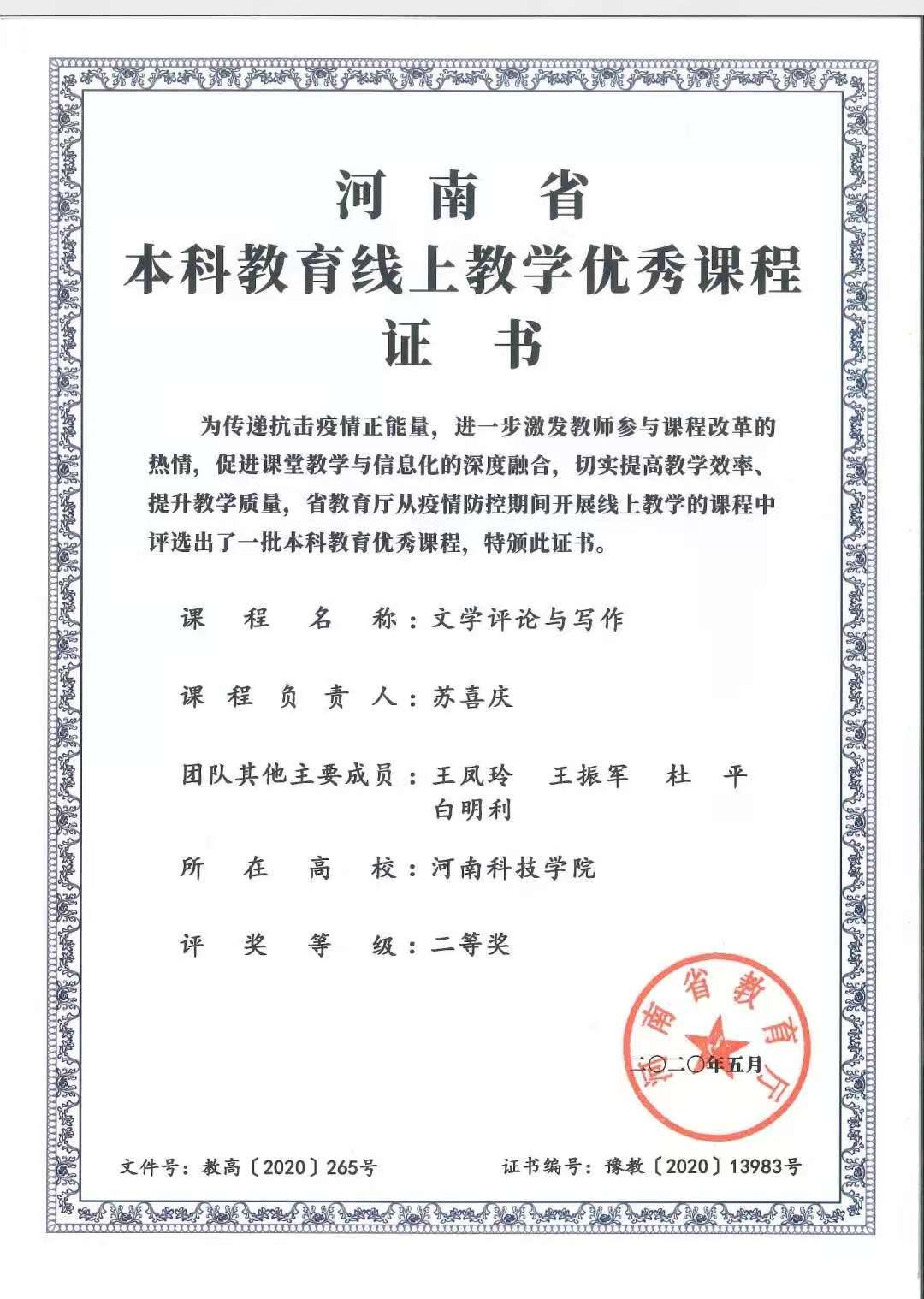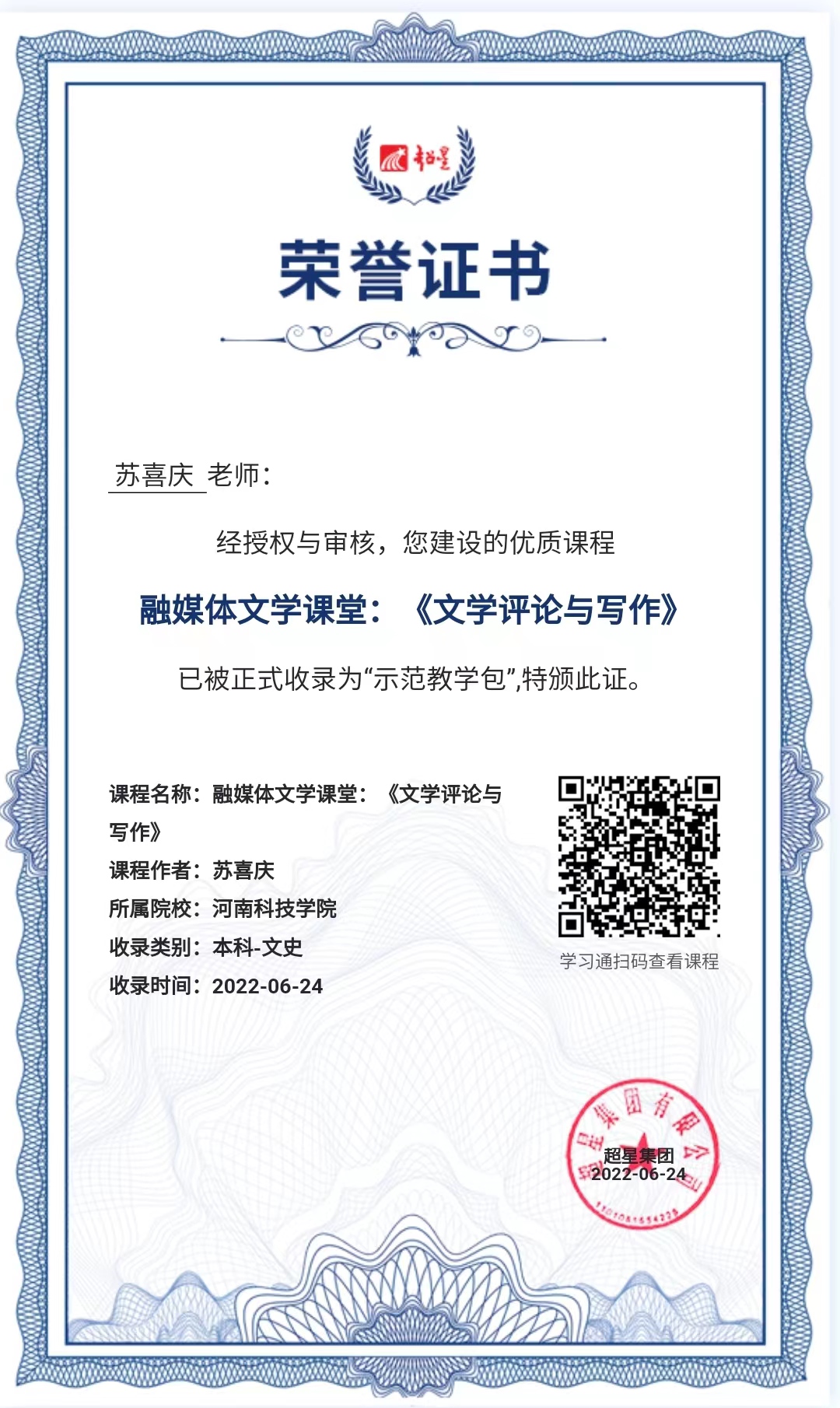 本课程是汉语言文学(师范)专业的专业基础课,也是面向全科学生开设的公选课,主要以介绍文学批评类写作的技巧和方法,重点选择20世纪以来中国文学评论和欧美文学思潮发展过程中影响巨大的一些批评方法作为写作的方法论,如社会学批评、意识形态批评、精神分析批评、形式主义、女权主义批评等,作为研究对象,在理论陈述、案例分析的基础上,结合深入阅读书目、思考问题等方面的内容,力求比较生动的再现文学批评的方法和使用技巧,从而提高学生运用批评方法的写作能力。课程先后荣获有省级课程思政样板课程(战疫类)、河南省优秀线上课程二等奖、河南省十四五规划教材建设项目和校级优秀精品在线课程。 目前,课程在线运行平台共有三个,分别为: 1.超星泛雅学习平台。网址:https://mooc1.chaoxing.com/course/206228419.html?edit=true 2.鹤壁市专业技术人员在线继续教育平台,在线学习网址:http://www.hbszjw.com/detail/91 3.微助教学习平台,在线网址:https://www.teachermate.com.cn/classes/1104070 4.哔哩哔哩网站:苏苏老师融媒体课堂:https://space.bilibili.com/311998085 【主讲人简介】 苏喜庆,男,博士,副教授,硕士研究生导师,文法学院办公室主任。河南大学博士后,河南省青年骨干教师,中国文艺评论家协会会员,中国文艺理论学会会员。主要从事文学理论、西方文论、地域审美文化的教学研究工作。近年来在《中国文学研究》、《中国文学批评》等国内学术期刊上发表论文30余篇,其中CSSCI收录11篇。参与国家社科基金重大项目1项、教育部人文社科项目2项,河南省首批一流本科课程《文学概论》负责人;河南省课程思政样板课程《文学评论与写作》(战疫类)负责人;主讲有省级优秀线上课程《文学评论与写作》;主持有省级教改项目、省哲社规划项目、省“十四五”规划教材建设项目、河南省高校科技重点项目1项等省级项目5项,出版学术著作2部,参编教材3部。荣获FANUC杯•首届中国职业技术师范院校教学能力大赛特等奖、河南省首届本科高校青年教师创新课堂大赛特等奖、河南省高校教师技能大赛二等奖(2018)、校青年教师技能大赛一等奖、校课堂创新大赛一等奖。先后荣获校级“十佳教师”、“优秀教师”、“优秀共产党员”、“师德先进个人”等荣誉称号。