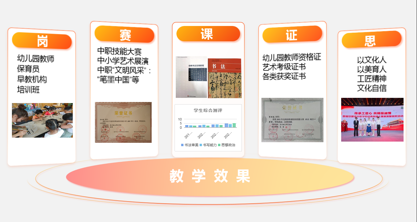 书法艺术是中国传统文化的体现,它对于培养人的道德素质、身心素质、智能素质和审美能力有着重要的作用。幼儿保育专业是学前教育的对口专业,是专门培养幼儿园教师的专业,幼儿教师的书写技能十分重要,教师规范的书体不仅是个人素质的展现和工作的需要,同时也与孩子的启蒙教育有着直接的连带关系。所以,学习书法对于幼师学生来说,不单单能够提高其汉字的书写技能,还有其更为深远的意义。幼师学生通过接受书法教育,在学习书法的过程中感受书法艺术中蕴含的线条美、艺术美、气韵美,从而陶冶情操、提高审美能力、增进学识修养。书法作为审美与实用的结合体,对调节心理素质、规范行为起到良好的作用。 本课程通过循序渐进的任务驱动使教学活动顺利展开,教学按照设疑、激趣、解疑、释疑使学生顺利的突破了教学的难点,圆满完成教学任务。基于学前教育专业课程,以真实工作任务为导向开展教学,帮助学生掌握课程重点,突破教学难点,使学生逐步具备岗位能力。借助教学平台、多媒体及多种app软件的使用,立足专业,激发学生学习兴趣,课后拓展任务有效开拓了学生视野,培养自主学习能力。基于书法课程的属性,融入多学科知识,做到因材施教,个性化教学。整个课程将思政元素贯穿教学全过程,实现润物细无声的教育教学效果。