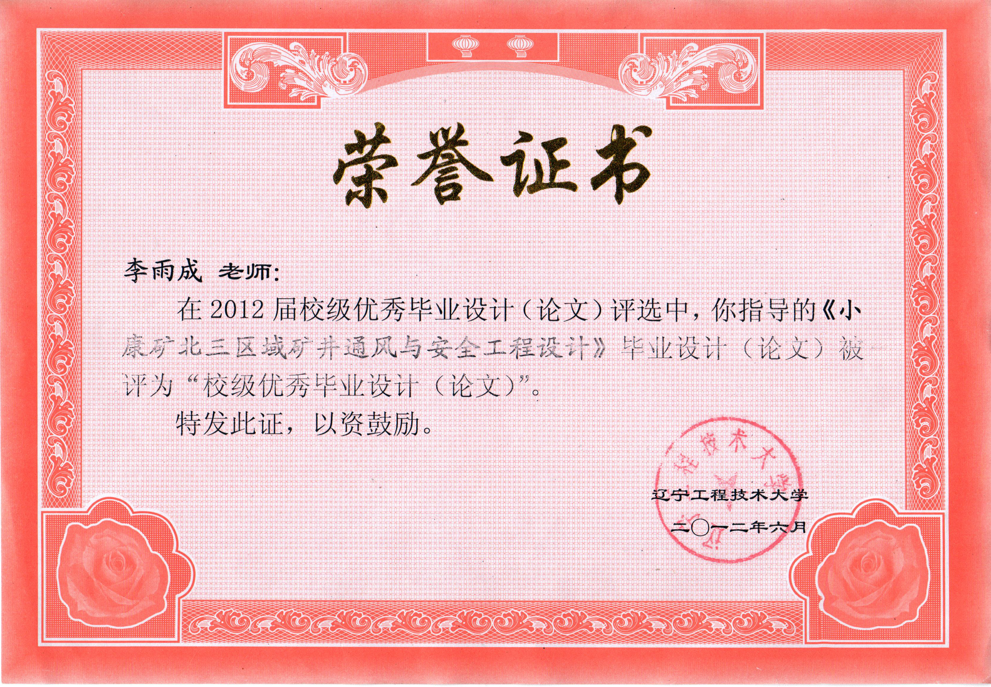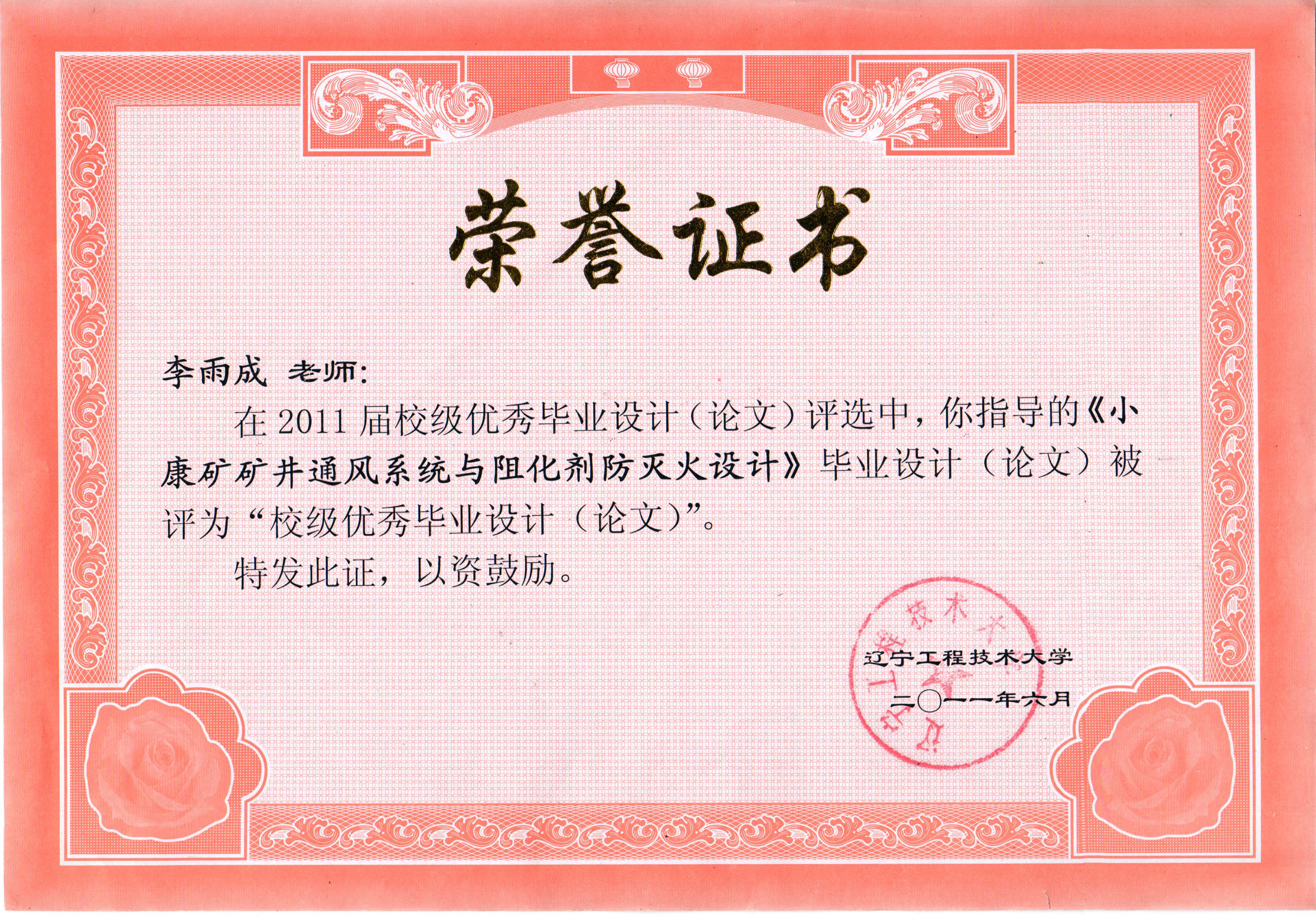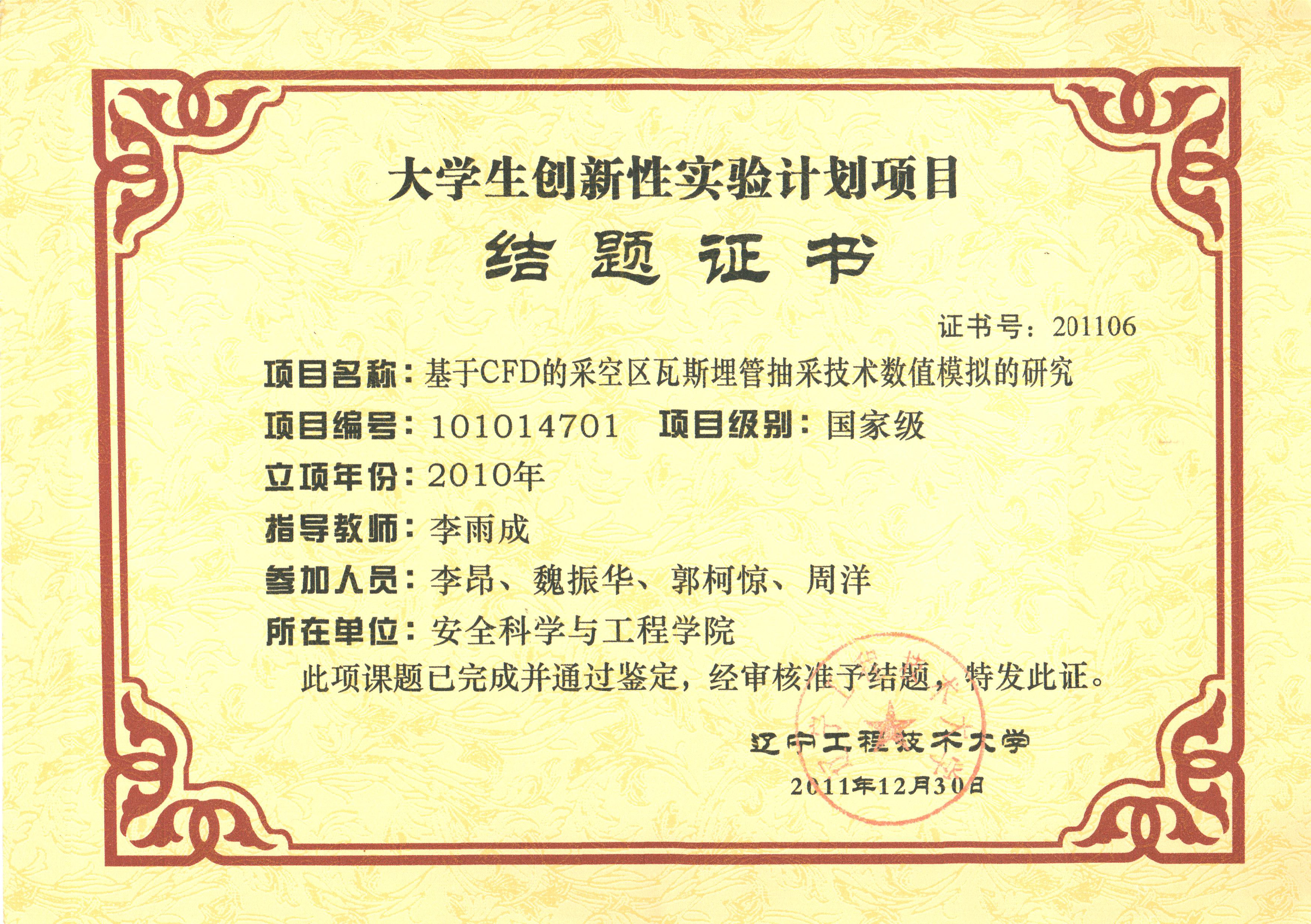 教师鼓励学生积极参加国家各级各类竞赛和科学研究项目等实践活动。学生在参与实践活动的过程中,学生不仅对矿井通风课程的兴趣以及学习的积极性有所提高,自主学习意识有所提高,并且取得优异成绩。本团队指导的与矿井通风课程相关的学生获得各级大学生创新创业训练计划项目4项(其中国家级3项、校级1项),辽宁省“挑战杯”科技作品竞赛获奖2项(其中二等奖1项,三等奖1项),全国采矿作品设计大赛获奖2项(其中一等奖1项、二等奖1项),全国安全作品大赛三等奖1项,指导校优秀毕业设计2项,多次获得“大学生良师益友”称号,优秀共产党员,优秀教师,“优秀指导教师”称号等。