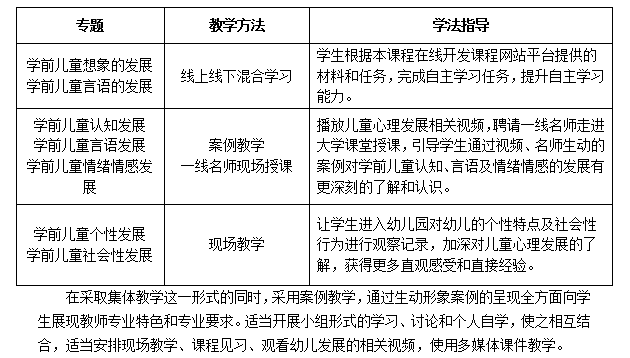 一、课程性质 《学前儿童发展心理学》是学前教育专业学生必修的专业基础理论课程之一。该课程的设置主要为幼儿教师正确理解儿童在认知、情感、个性、社会性等方面的心理规律和特点,正确地实施教育教学行为、学会更好地尊重、保护和引领幼儿的发展提供心理学理论依据。它为后续课程如《学前教育原理》《教育心理学》及五大领域课程的开设提供了心理学依据。该课程对能够胜任学前教育机构的教学工作和管理工作的应用型人才的培养提供了必要的专业理论基础,是重要的专业基础课程。 二、课程目标 1.理解学前儿童各年龄阶段心理发展的特征及表现差异,掌握学前儿童身心发展的规律;掌握学前儿童在认知、言语、情绪、个性及社会性等方面发展的知识和理论;具备对学前儿童的发展给予有效指导的方法和技能。(支撑毕业要求3、4、6) 2.形成运用儿童发展心理学知识去分析和解决教育过程中实际问题的能力;对学前儿童的行为、表现进行心理分析的能力;对学前儿童的发展给予指导的能力;与学前儿童进行有效沟通的能力等。(支撑毕业要求4) 3.培养热爱幼儿、喜欢幼儿教育工作,进而树立热爱幼教事业的专业情感;树立正确的儿童观、发展观及教育观。(支撑毕业要求2) 三、课程的内容设计 (一)课程内容、学时安排 本课程的教学内容共六个部分:一、学前儿童发展心理学概述; 二、学前儿童各年龄阶段心理发展及特点;三、学前儿童注意的发展;四、学前儿童认知的发展;五、学前儿童言语的发展;六、学前儿童情绪情感的发展;七、学前儿童社会性发展、八、学前儿童个性的发展。 课程共28学时,讲授20学时,实践教学活动8学时,主要的实践形式有观摩教学视频、现场教学等。 (二)课程设计思路 在课程教学中,坚持“以儿童心理发展的基础理论为根基、以理论的实际运用为目标”的理念。针对本专业学生及未来职业的特点,课程的开发以校、园合作为切入点;课程的设计以以职业能力培养为核心;课程的实施以案例-情境-陶冶教学为主线,着力培养学生的职业能力,进而,促其实践智慧的生成。 本课程的教学难点是对学前儿童心理研究方法的掌握及对学前儿童思维、个性发展特点和规律的理解。解决方案:通过观看视频、到幼儿园见习观摩,使学生了解儿童的心理规律,学会分析儿童的行为及其背后的心理规律。 四、课程的重点和难点 本课程的教学重点一是基本概念和基本知识;二是如何把所学理论与生活和工作实践中所遇到的学前儿童心理表现及教育问题结合起来。解决方案:结合案例讲解分析儿童发展的心理规律,再让学生自己很据生活中的经验验证规律。结合实践教学,通过在幼儿园进行现场教学,将知与行紧密结合起来,让理论真正能够指导实践。 五、学情分析 本课程主要面向学前教育专业四年制本科的学生开设。普通四年制本科学生文化基础相对较好,学习主动性、积极性较高,教学效果能够得到较好的保障。 知识方面:本课程要求有《普通心理学》的相关知识作为学习基础。这门课程在上一学期已经开出,学生有了这方面的知识,具备了相应的知识结构。对于学习本课程奠定了一定的良好基础。 认知方面:学生具有较强的理解能力,尤其是本科生,在一些问题的设置,新知的探索方面可以多给他们一定的主动思考和探索的机会。 情感方面:大多数学生属于独生子女,在家庭中处于受照顾者、受宠者的位置,对于幼儿缺乏应有的情感和关爱,这是当前所有学生的通病,本课程重在让学生对幼儿心理发展充分把握的同时,增强对幼儿的情感,适应幼儿教师的情感要求。 六、课程学习建议 1.案例学习 倡导以案例为中心,通过典型的教学案例来突出教学任务的真实性,使学生在“教学现场”中发现和提出化学教学问题,在对案例的讨论和分析中寻求解决问题的办法、获得相关的知识与技能、能力与方法。 2.小组合作学习 以小组为单位进行与教学内容相关的小组讨论、案例分析,并以主题发言或研究性小论文的方式在全班范围内进行展示。 3.线上线下混合学习 本课程建设成为在线开放课程,部分学习资料和课程录像已经上传至网站,面向社会开放共享,学生可以采取线上学习,线下讨论、合作的形式进行混合式学习。 4.现场教学 通过课上学习,了解幼儿的心理发展特点和规律,对于一些疑惑或者理解有困难的问题及内容,可以到幼儿园中进行现场教学,同时,课上设计的测查项目及实验项目可以借助行为观察室或者课程见习的方式进行实施。
