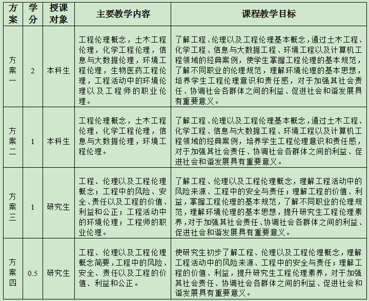 无论哪种教学方案,课程教学的最终目的是:培养学生工程伦理意识和责任感,掌握工程伦理的基本规范,提高工程伦理的决策能力,树立正确的利益价值观。通过工程伦理教育,培养未来的工程科技人才,实现人与自然的和谐发展。