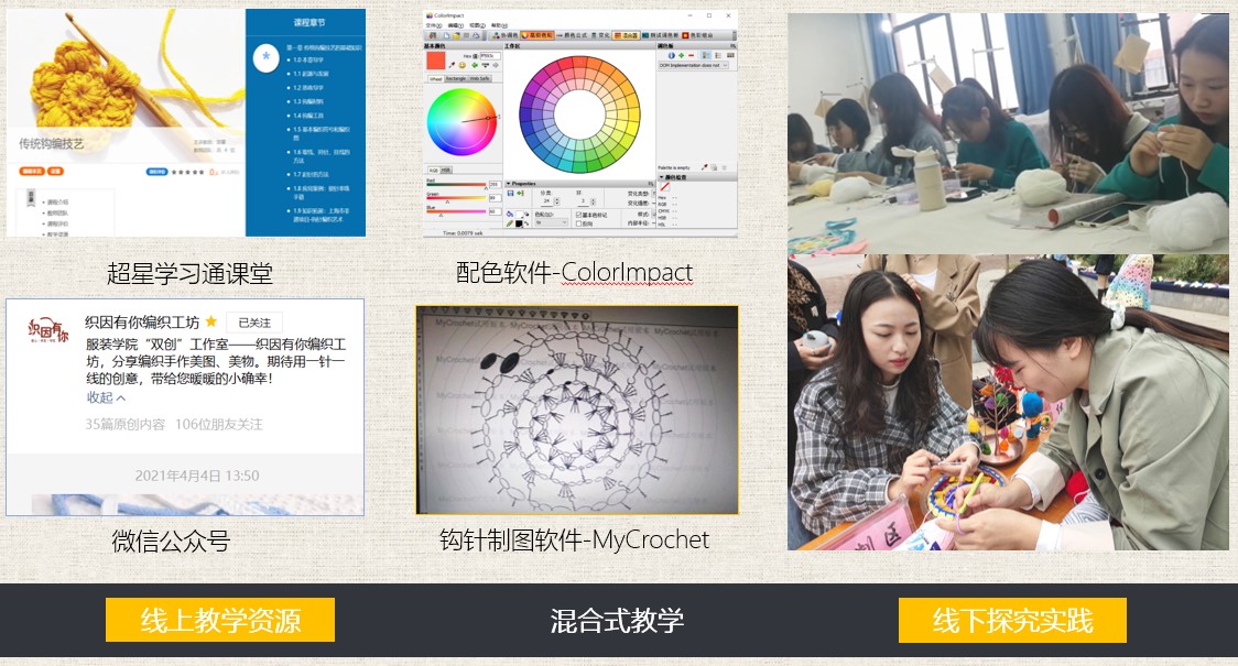 《传统钩编技艺》是一门研究钩针与毛线创意产出的通识选修课,面向高等院校在校学生、编织从业者、爱好者开课。教学内容包括传统钩编技艺的基础知识、传统钩编技艺的针法、环形钩编工艺与技法、花样钩编工艺与技法、钩编艺术作品赏析等五个章节内容,其中每个章节均设置导学内容、基础知识、应用案例、思政案例和知识拓展模块。