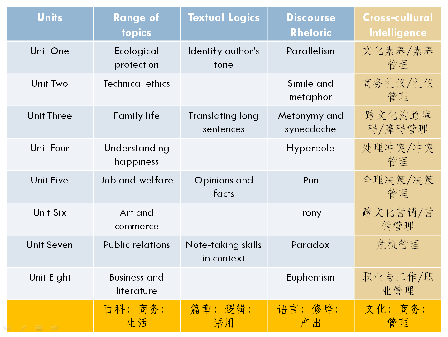 2. 通过了解多样化的商务主题,掌握较为系统的商务专业知识,培养较为扎实的国际商务沟通能力;