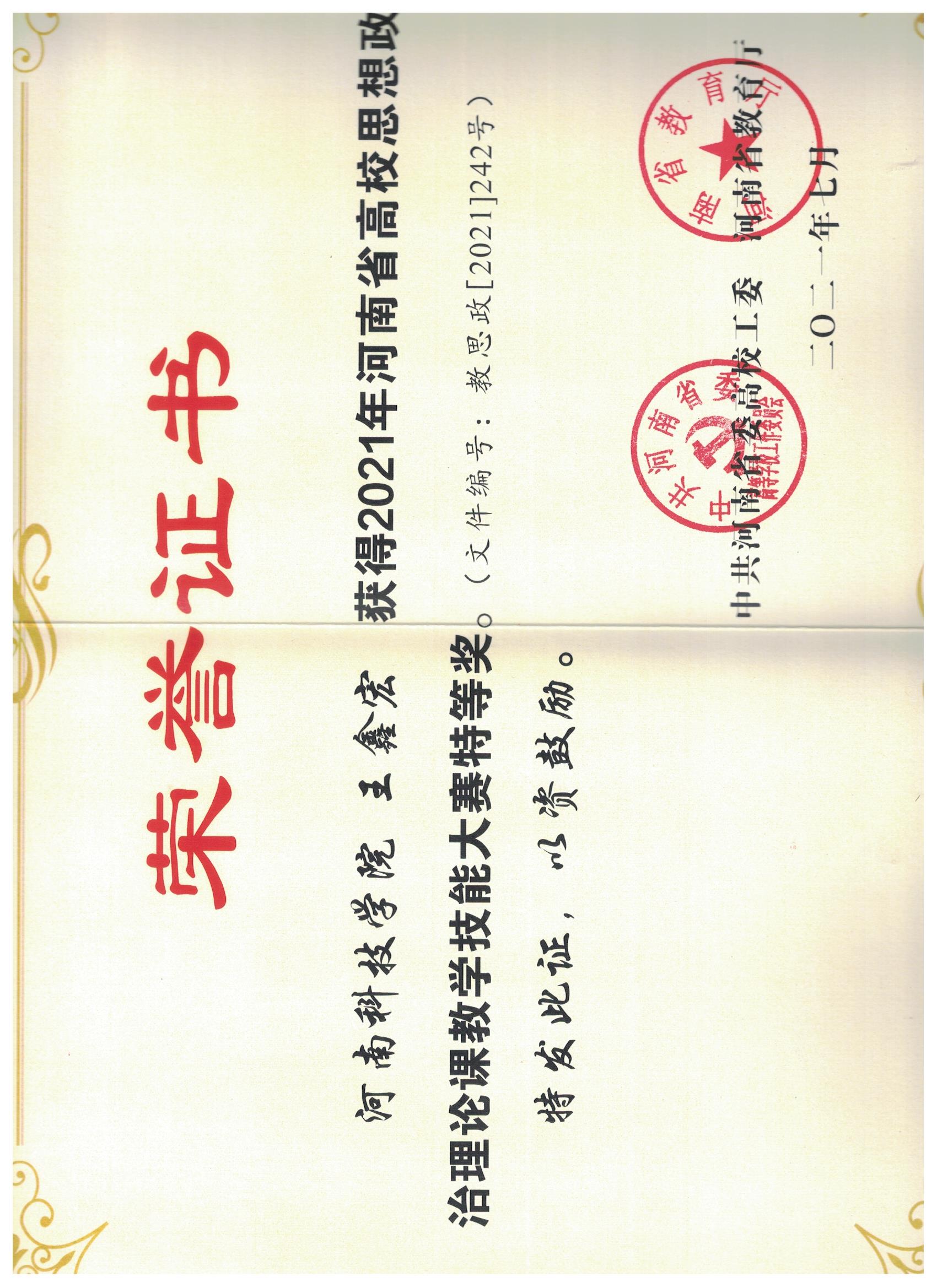 3.王鑫宏:河南省高校思想政治理论课教师教学技能竞赛特等奖,2021年7月,中共河南省委教育工委、河南省教育厅。