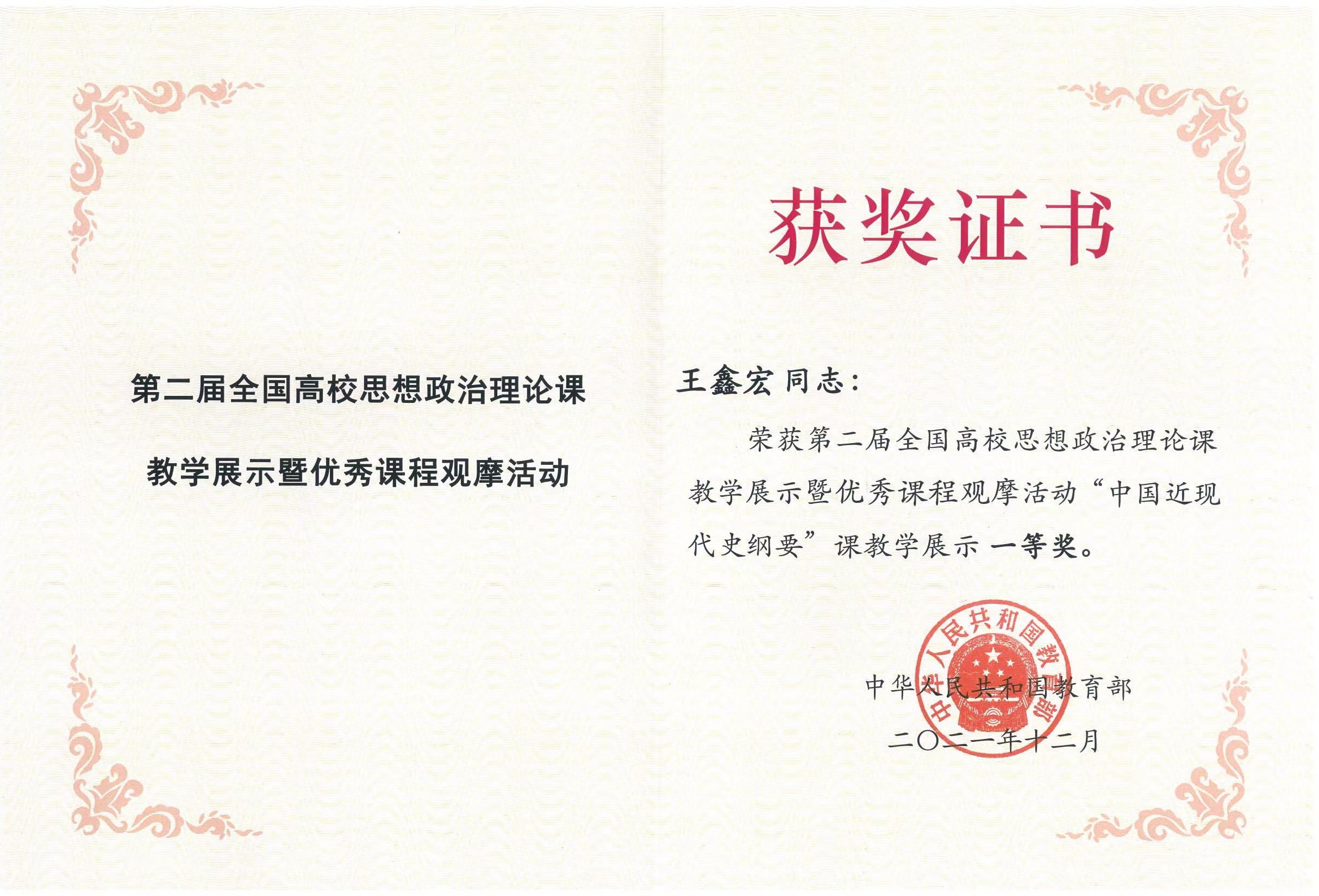 1.王鑫宏:全国高校思想政治理论课教师教学展示暨优秀课程观摩活动一等奖,2021年12月,中华人民共和国教育部。