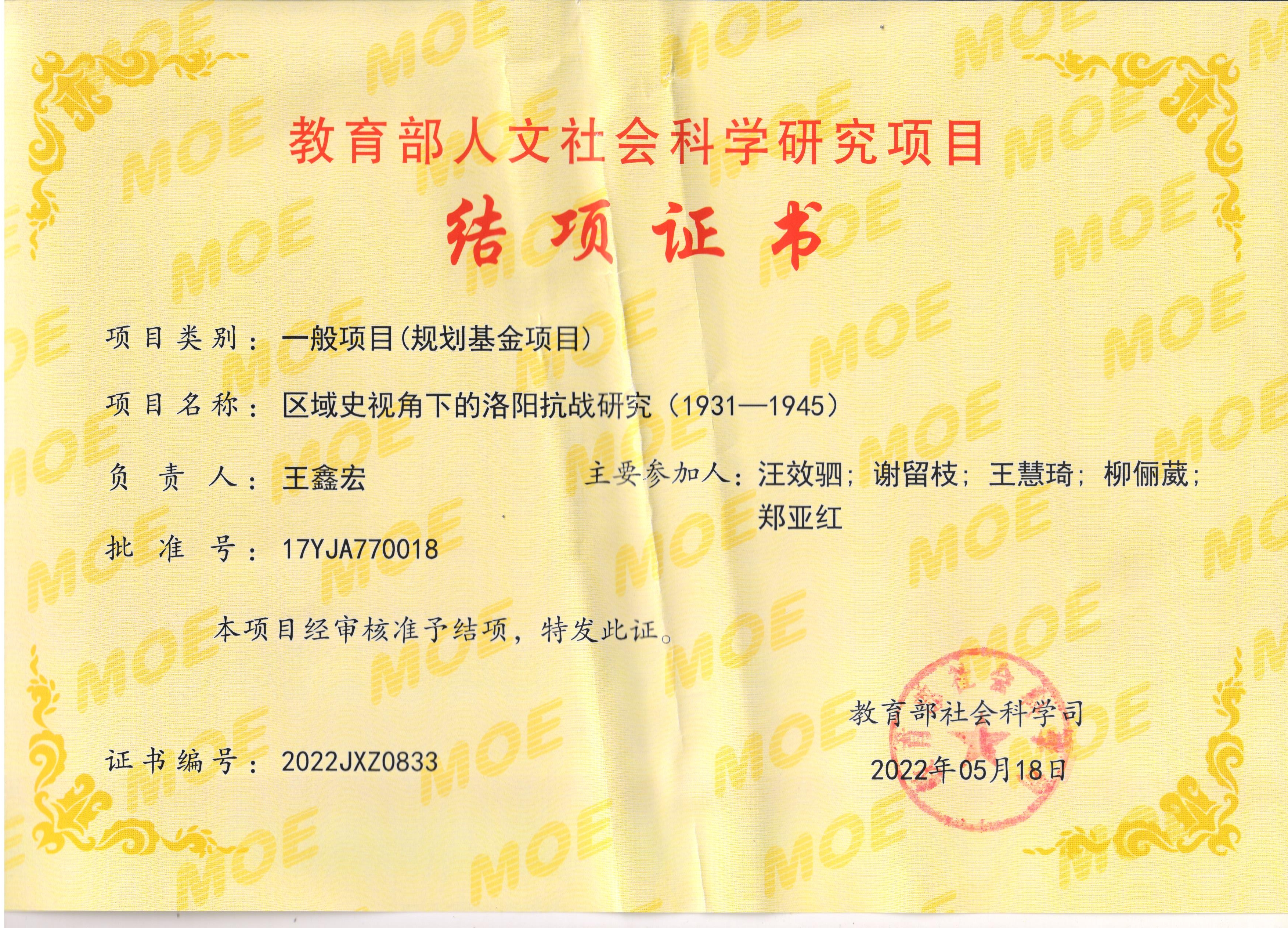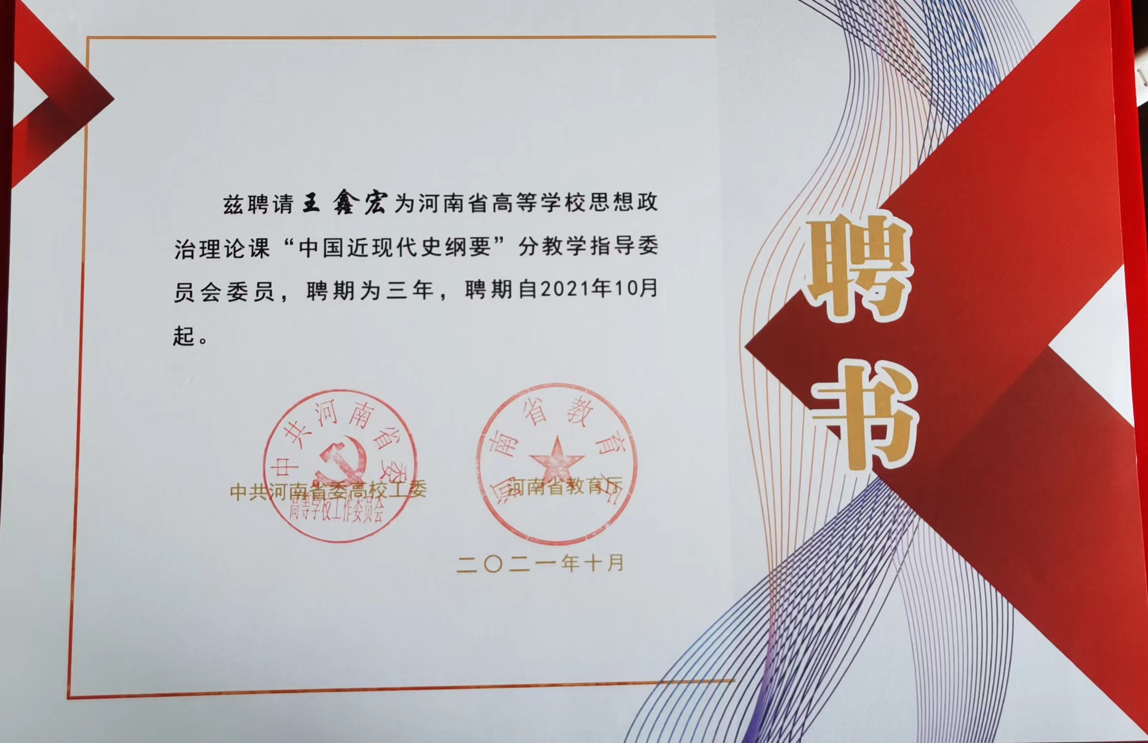 2.王鑫宏:第二届河南省高校思想政治理论课教学指导委员会“中国近现代史纲要”分教学指导委员会委员,2021—2023,河南省教育厅。