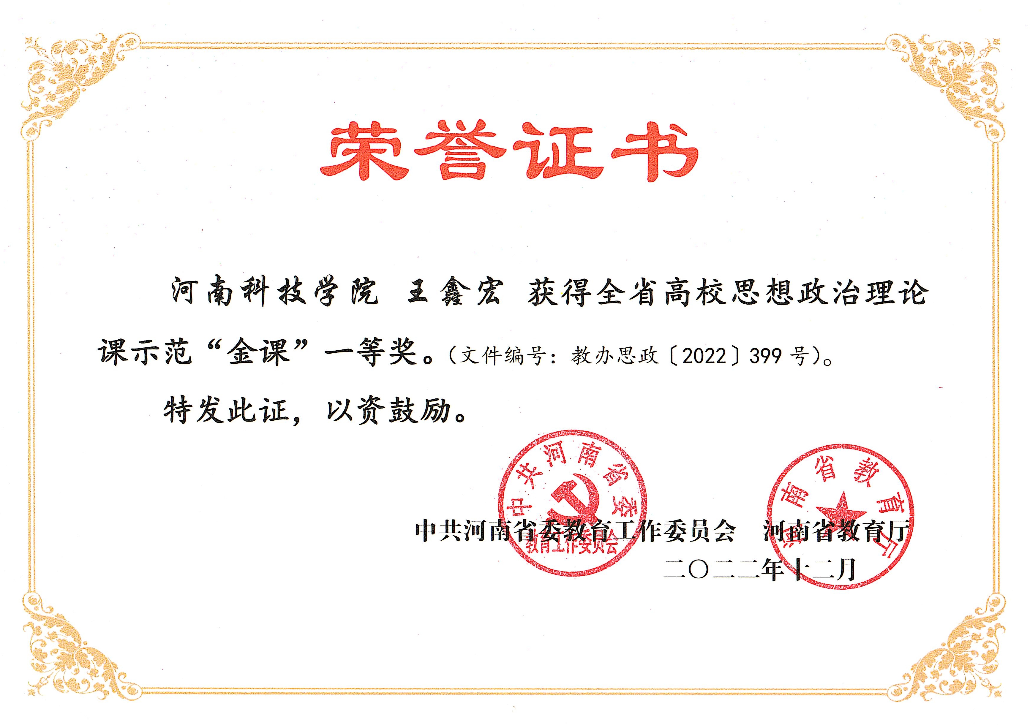 4.王鑫宏:河南省高校思想政治理论课示范“金课”评选一等奖,2022年12月,中共河南省委教育工委、河南省教育厅。