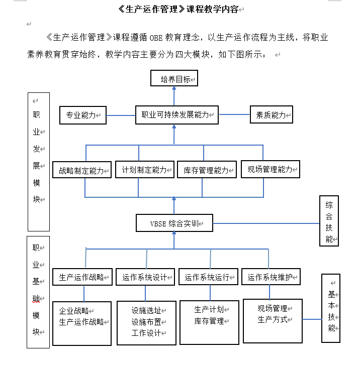 在教学中,该课程遵循OBE教育理念,以生产运作流程为主线,将职业素养教育贯穿始终,教学内容主要分为四大模块:生产运作战略、生产运作系统设计、生产运作系统运行以及生产运作系统维护。课程将帮助学习者了解生产运作管理的基本理论,熟悉和掌握生产运作中的基本模型,使学习者具备管理分析、决策的技能水平,达到企业对生产服务人员的要求。
