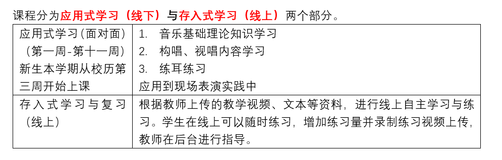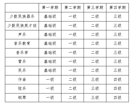 音乐基础理论部分按四个学期进行教学。视唱练耳部分按级序进行教学,分设基础级和一到四级序。每一级序为一个学期,按不同专业编班授课(见下表1)。采用音乐基础理论与视唱练耳相结合的教学模式。