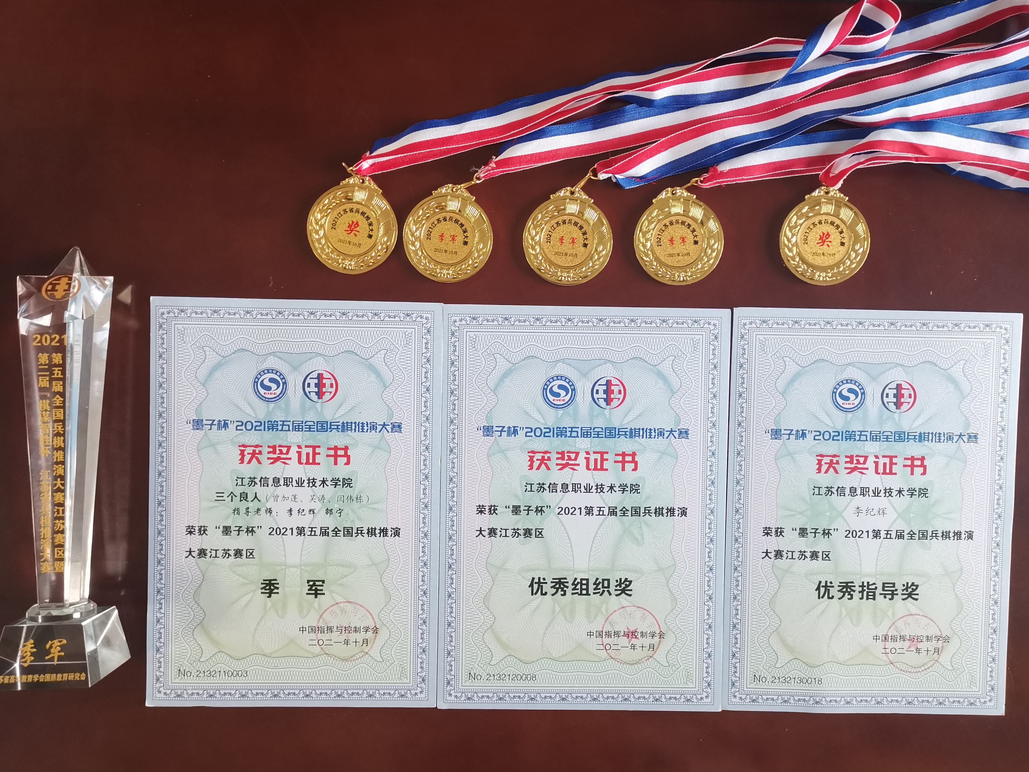 2021年10月30日,“墨子杯”2021第五届全国兵棋推演大赛江苏赛区比赛在东南大学落下帷幕,在士官学院老师邵宁、李纪辉指导下,由学员曾加蓬、吴涛、闫伟栋组成的“三个良人”战队,经过小组赛、多轮淘汰赛,获省赛一等奖、季军称号。学校获优秀组织奖,李纪辉老师获优秀指导奖。作为江苏省代表队参加全国大赛获得国赛三等奖。