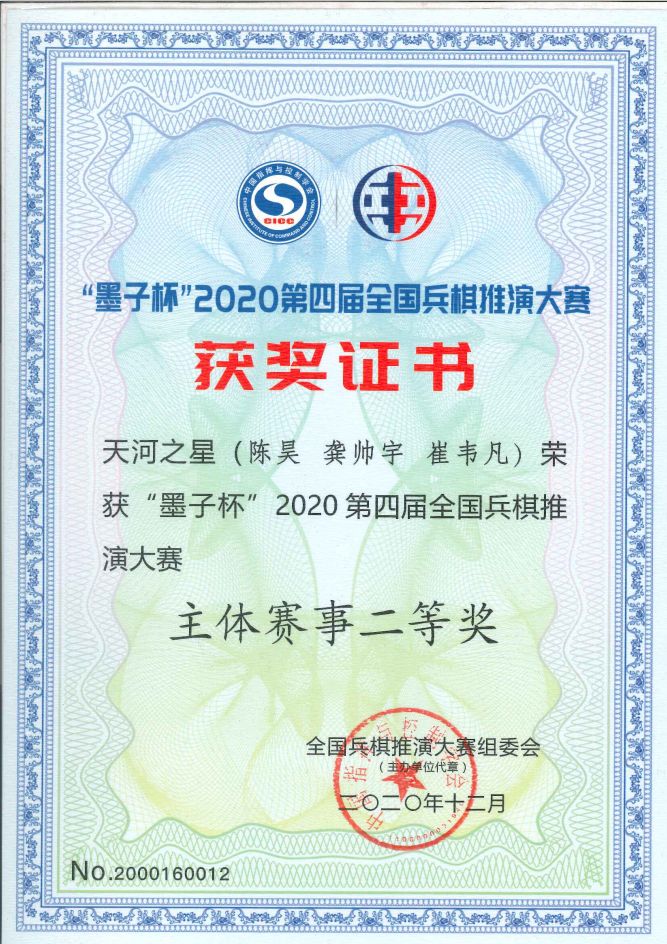 2020年11月21日,“墨子杯”2020第四届全国兵棋推演大赛江苏赛区比赛落下帷幕,由我校士官学员陈昊、龚帅宇、崔韦凡组成的“天河之星”战队获一等奖,指导老师邵宁获优秀指导奖,学校获优秀组织奖,后在全国比赛中获得国赛二等奖。