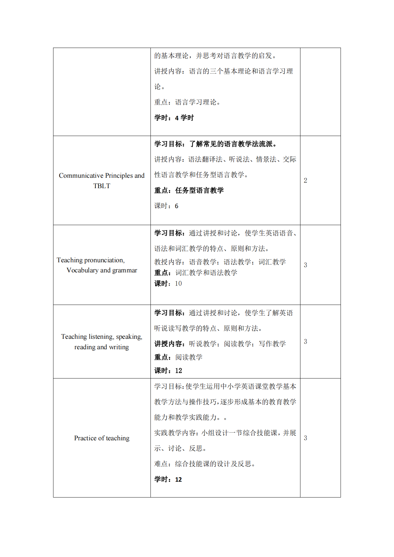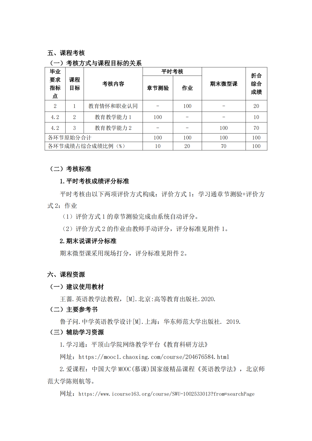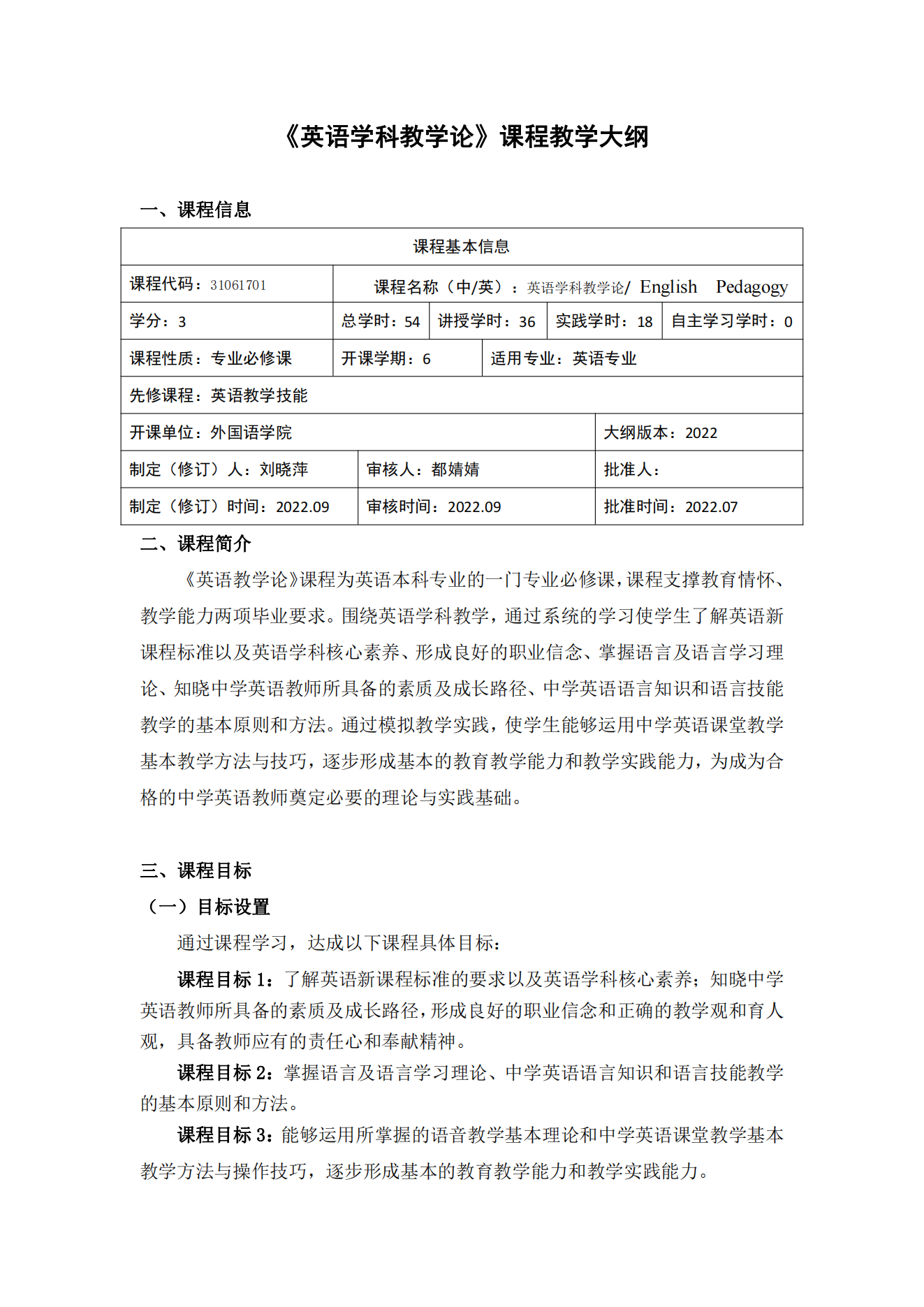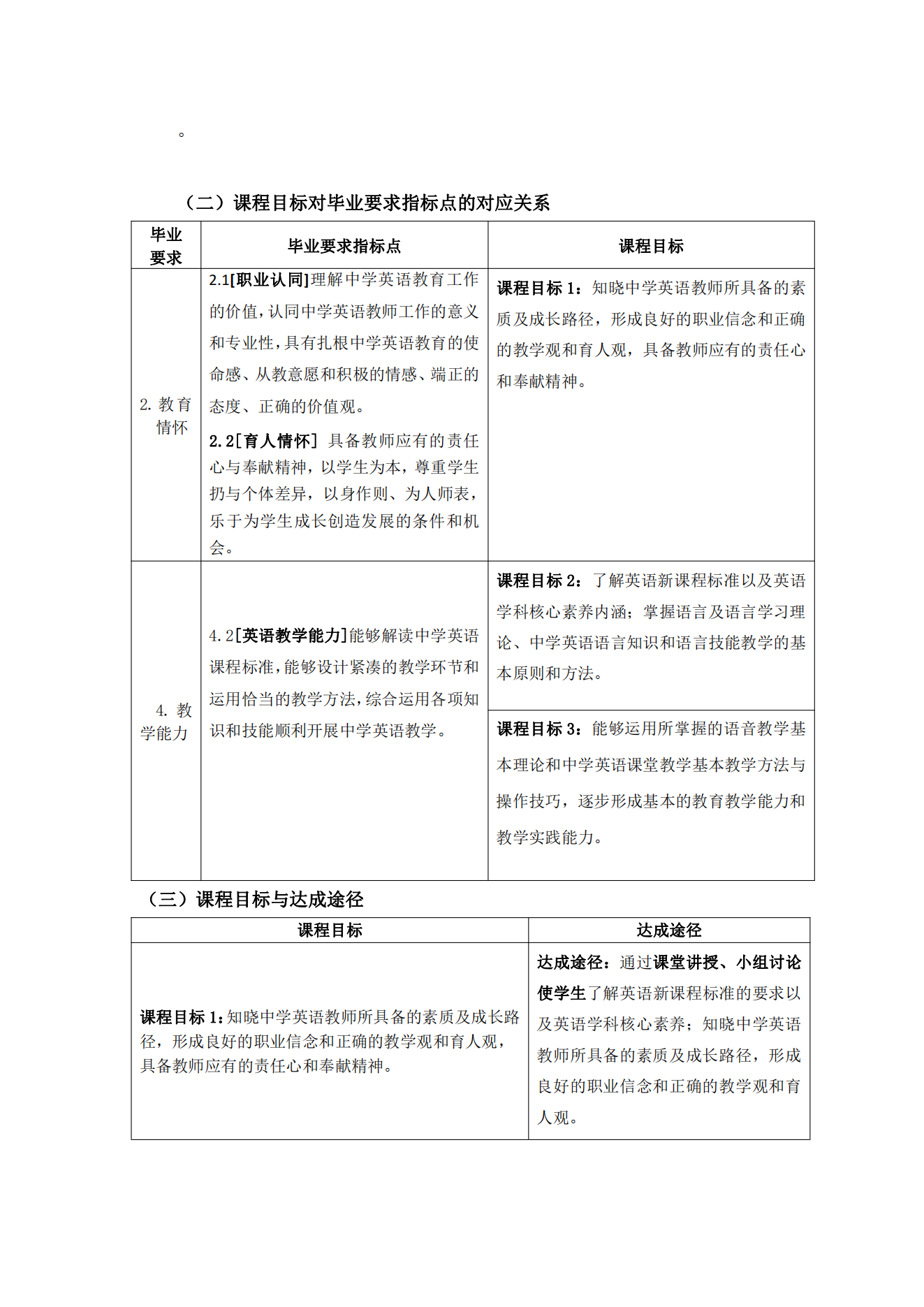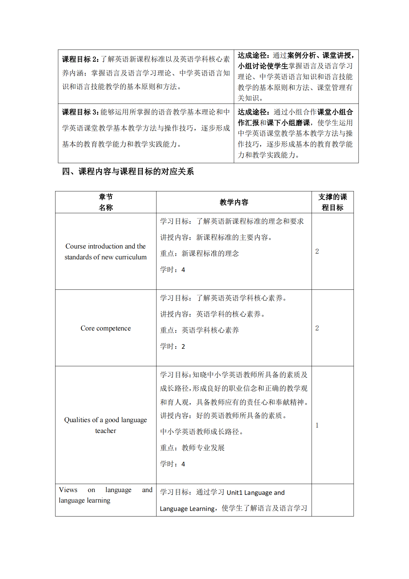 《英语学科教学论》课程为英语本科专业的一门专业必修课,课程支撑教育情怀、教学能力两项毕业要求。围绕英语学科教学,通过系统的学习使学生了解英语新课程标准以及英语学科核心素养、形成良好的职业信念、掌握语言及语言学习理论、知晓中学英语教师所具备的素质及成长路径、中学英语语言知识和语言技能教学的基本原则和方法。通过模拟教学实践,使学生能够运用中学英语课堂教学基本教学方法与技巧,逐步形成基本的教育教学能力和教学实践能力,为成为合格的中学英语教师奠定必要的理论与实践基础。