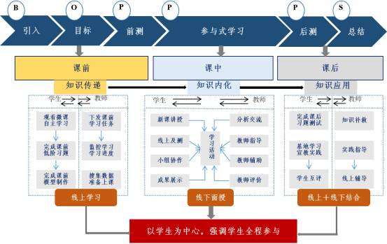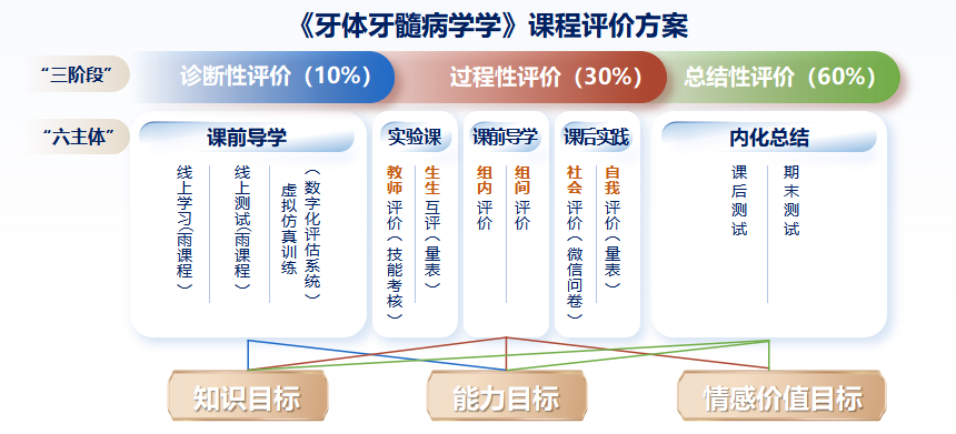 为恪守学校服务基层,培养有温度的基层健康守护者办学定位,根据口腔医学专业人才培养目标和教学大纲,坚持以学生为中心,立德树人,强调学生全程参与,注重学生全面发展,贯彻 OBE 教育理念,通过BOPPPS线上线下混合式教学模式,实现知识、能力和素质三位一体教学目标:
