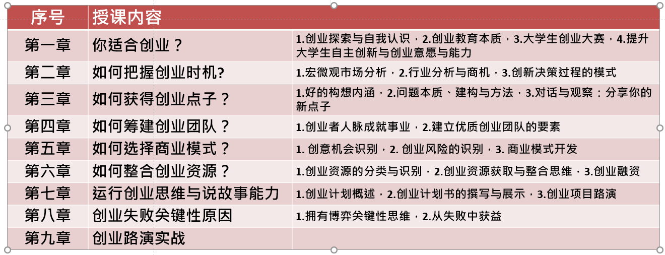 创业家如何走向成功之路? 才华之外,更要拥有经营管理事业的专业能力! 本课程是面向全校学生开设的通识必修课程,是对高校学生进行创业教育的主渠道,根据教育部《普通本科学校创业教育基本要求(试行)》([高教2012]4号),以及学校的人才培养目标和学生创业就业的需求情况开设。 通过混合式的在线中国大学慕课(MOOC)与线下教学开展创业教学课程,使学生掌握创业的基础知识和基本理论,熟悉创业的基本流程和基本方法,了解创业的法律法规和相关政策,培养学生创新意识,激发学生的创业意识,提高学生的社会责任感、创新精神和创业能力,促进学生创业就业和全面发展,增加学生服务社会能力。 文字深入浅出,给高校生详解创业者的必经难题。无论是学术界的专业研究,或是实务界的应用,“创业”已然成为学术界与实务界共同重视,并广泛予以应用及研究的学门。 具体任务分解: 1、开课教授创业基础知识:开展混合式基础创业知识与核心创业能力提升的课程教学; 2、体验式锻炼学生创业能力:使用创业导师实践讲座模拟、创业项目路演、创业实践等模式,检视自身与创业条件的准备 。
