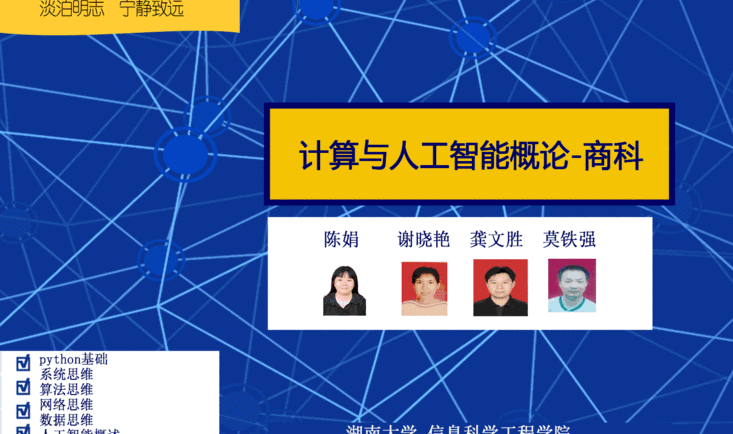 计算与人工智能概论(商科)是一门面向大学低年级商科学生的信息类公共基础课程。本课程首先讲解python程序设计的基础知识:数字、字符数据类型;顺序、分支、循环控制结构;元组、集合、列表、字典组合数据类型。培养学生由问题到算法的分析能力,以及程序编写和调试的能力。然后再深入介绍计算中的系统思维、网络思维、数据思维、算法思维,使学生了解计算学科中的重要概念,掌握使用python相关库实现文件夹和文件操作、网络数据爬取、数据分析、数据管理、算法优化等应用。最后介绍人工智能算法及应用,使学生理解经典算法,并将其应用于实际问题。 课程强调能力培养,改变传统“知识输出”方式,转为以学生为中心的“能力训练”方式。课堂采取案例教学模式,实验采取游戏闯关的实训模式,测试采用以考察实际编程能力为主的机器考试。 课程采用线上线下混合教学方式,超星课程网站提供包括视频、课件、样卷、课堂小测丰富的教学资源, educoder头哥网站为实验、小测和考试平台。 课程促进学生的计算思维与各专业思维交叉融合形成复合型思维,培养人工智能创新发展理念,为学生今后设计构造和应用各种计算系统,求解本学科问题奠定基础。