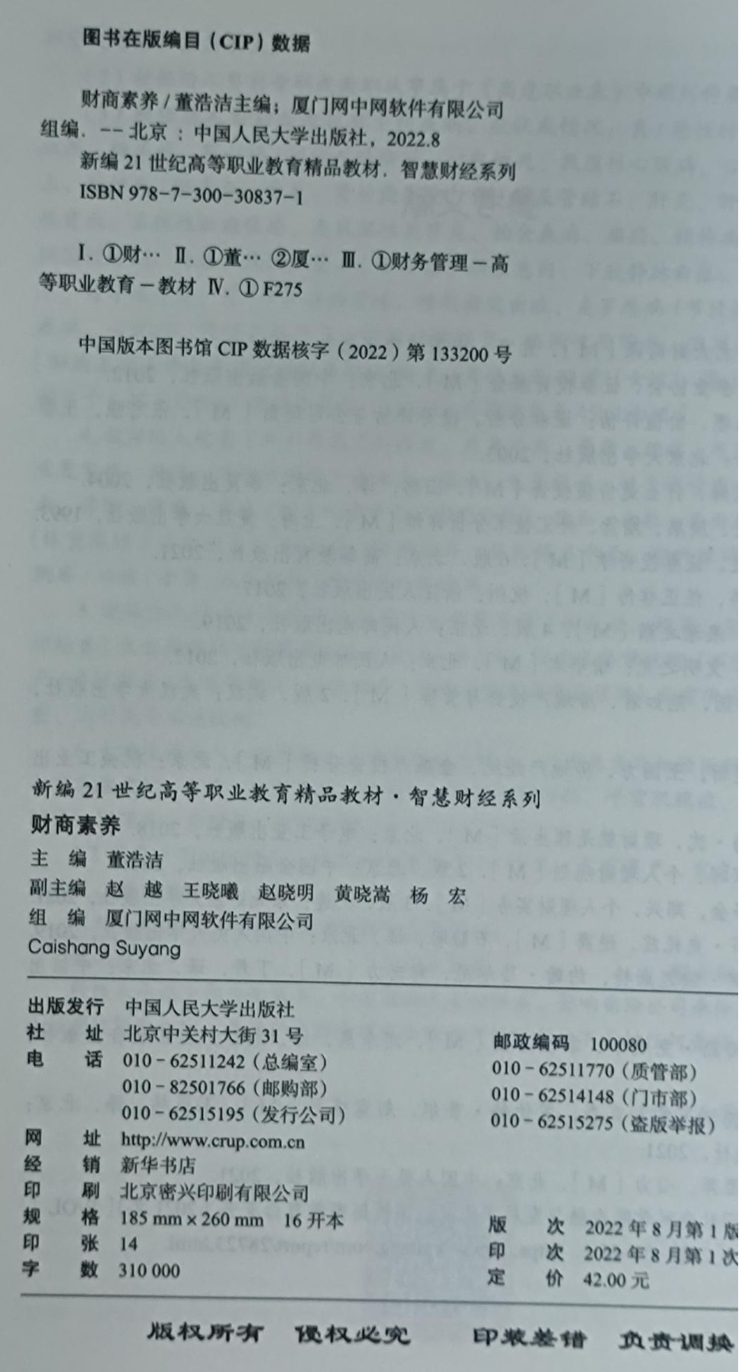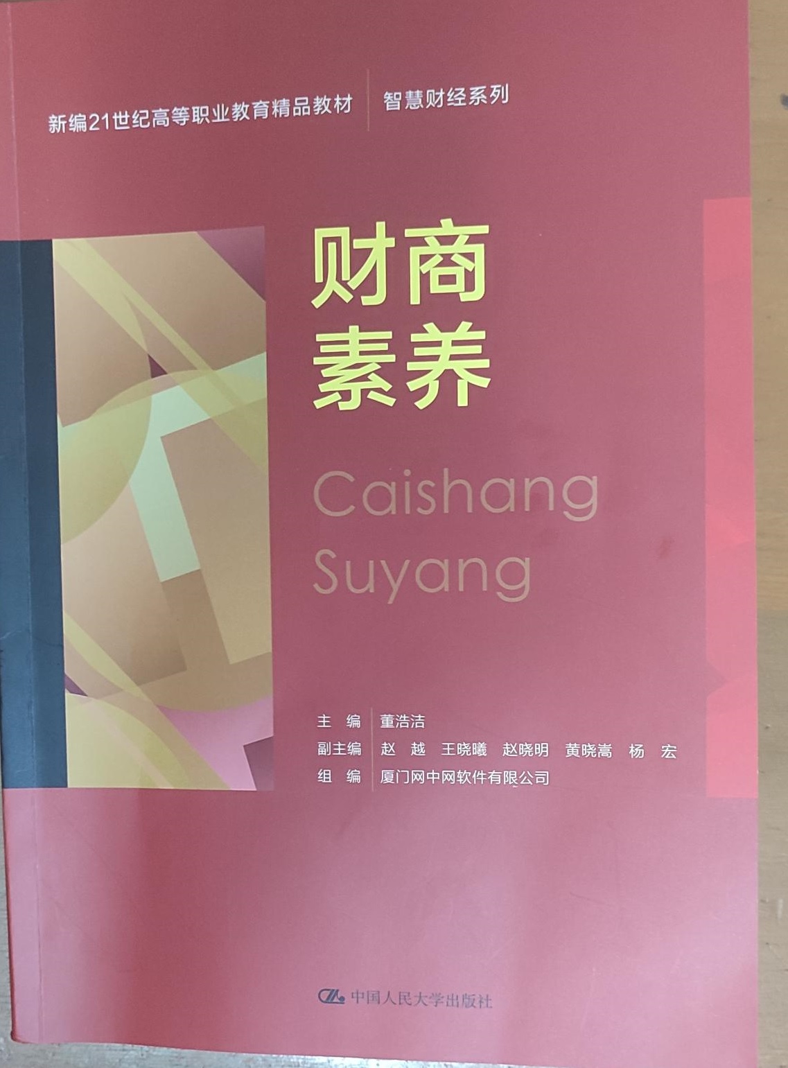 本课程选用中国人民大学出版社智慧财经系列教材《财商素养》,主编董浩洁,2022年8月出版。见图片。