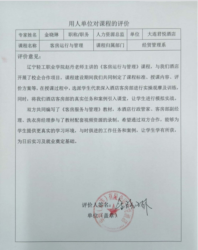 通过本课程学习,学生能够了解酒店客房部的职能,掌握酒店客房部各项对客服务工作的操作流程、标准和服务技能;熟悉客房部运行管理方法;养成良好的职业道德和职业素养,较强的劳动意识、质量意识、服务意识、创新意识和安全意识;培养良好的沟通能力、团队协作能力、应变能力、中英文语言表达能力等;为今后迅速适应酒店客房运行与管理工作打好基础。| 课程章节 | | 文件类型 | | 修改时间 | | 大小 | | 备注 | |