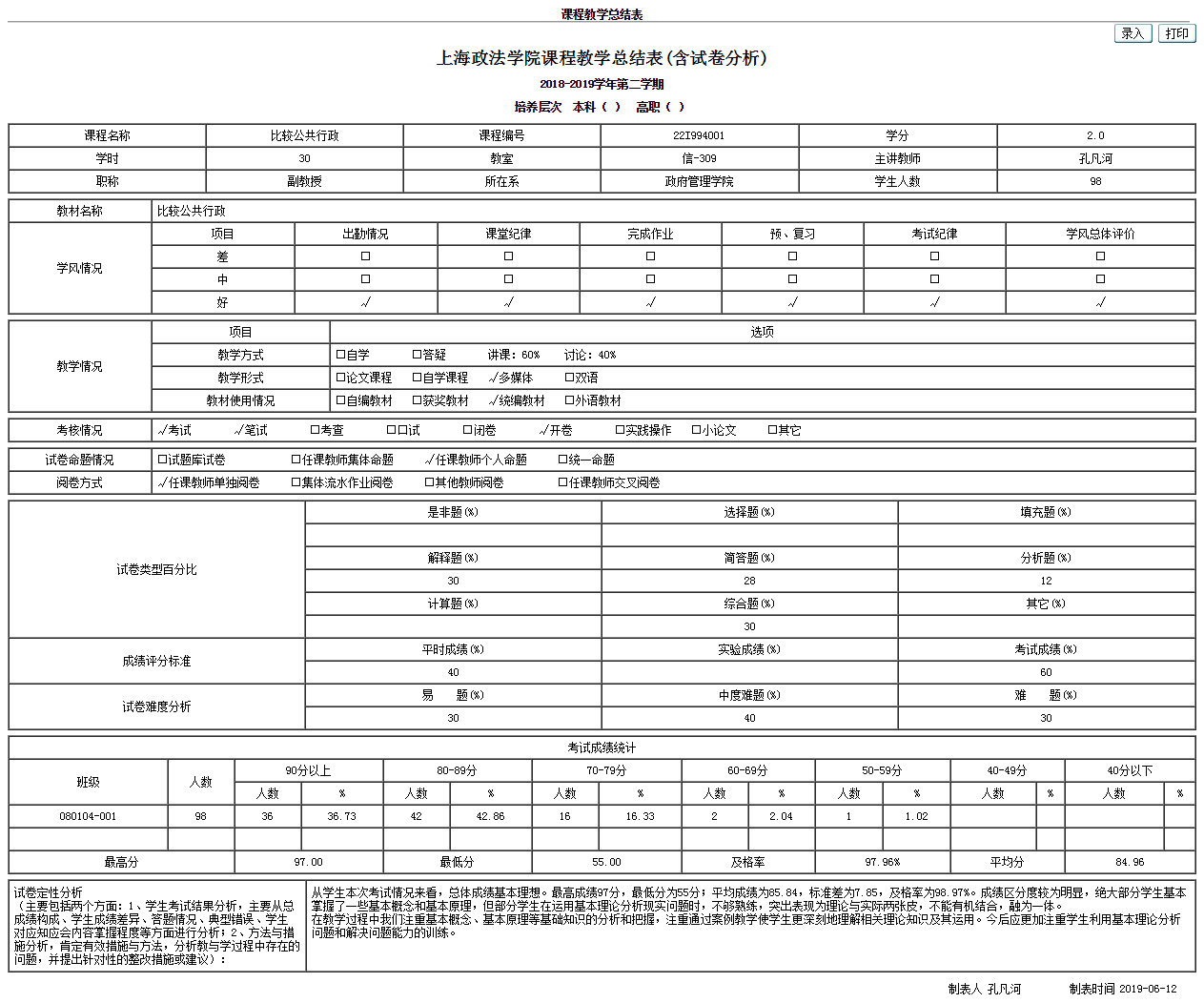 课程教师团队构成合理,知识结构完善。6位主讲教师具有复旦大学、华东师范大学、吉林大学、中山大学、上海大学等著名高校管理学、政治学、社会学博士学位,科研方面训练有素。在长期的教学工作实践中,积累了丰富的教学经验。课程负责人孔凡河毕业于华东师范大学政治学理论专业,获得法学博士学位。2024年所授课程“行政学原理”荣获“上海市级一流本科课程”荣誉称号。2022年所授课程“行政学原理”荣获“上海高校课程思政示范课”荣誉称号。2021年所授课程“行政学原理”荣获上海高校党史学习教育与课程相融合示范课程。2022年所授课程“行政管理学”荣获上海高校市级重点课程建设立项。2024年所授课程“比较公共行政”荣获上海政法学院校级课程思政改革培育项目立项。2019年主持“上海高校课程思政重点改革领航学院”课程建设项目“行政学原理”。2017年主持上海政法学院课堂教学方式方法改革项目:“政治学与行政管理专业课程组考核方式改革”。2016年荣获“上海政法学院教书育人楷模”荣誉称号。2015年主持上海政法学院教师教学能力发展中心建设项目:“行政案例分析研讨课程”。教学团队成员王慧博教授2020年所授课程“人力资源管理”荣获国家级一流本科课程。2022年荣获“全国宝钢优秀教师奖”。2022年荣获第二届上海市高校教师教学创新大赛“一等奖”。2023年荣获“上海市教育系统巾帼建功标兵”称号。教学团队成员杨玲丽教授2024年在第四届上海市高校教师教学创新大赛中获得课程思政组“二等奖”。2024年所授课程“社会保障统计与信息管理系统”荣获上海市一流本科课程。2022年所授课程“社会福利与社会救助”荣获上海高校课程思政示范课程。2015年荣获上海政法学院“教学示范岗”荣誉称号。课程团队成员王聪副教授2023年所授课程“基层自治与地方治理”荣获上海市重点课程建设立项。2022年所授课程“基层自治与地方治理”荣获上海市课程思政示范课程。