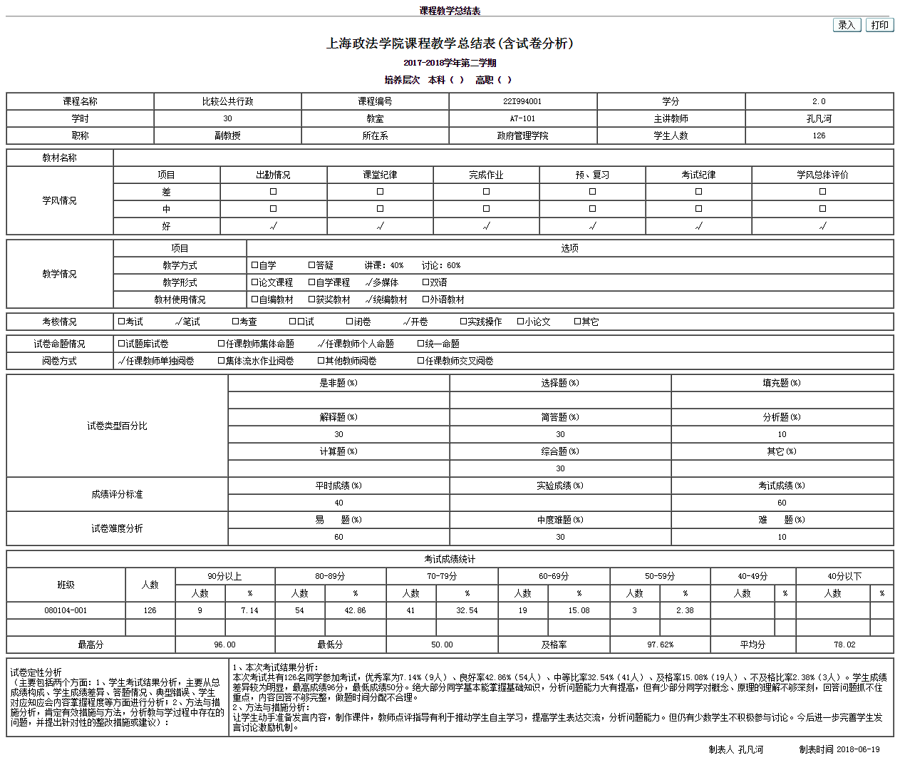 “比较公共行政”课程建设中注重引进优质师资,通过外引与内培等方式使任课教师中博士学位比例达到100%。同时,促进不同学缘的教师之间的交流,实现教师不同知识背景和学术优势的互补。目前,本教研室教师来自上海乃至全国多个高校,这些不同学缘结构和知识背景的教师的交流和帮助,对于行政学学科基础理论性课程“行政管理学”的建设,尤其是课程主讲年青教师的成长,起到了积极促进和专业支撑作用。同时,以科研促进教学,督促任课教师及时将科研中的最新成果引入课程教学内容之中。