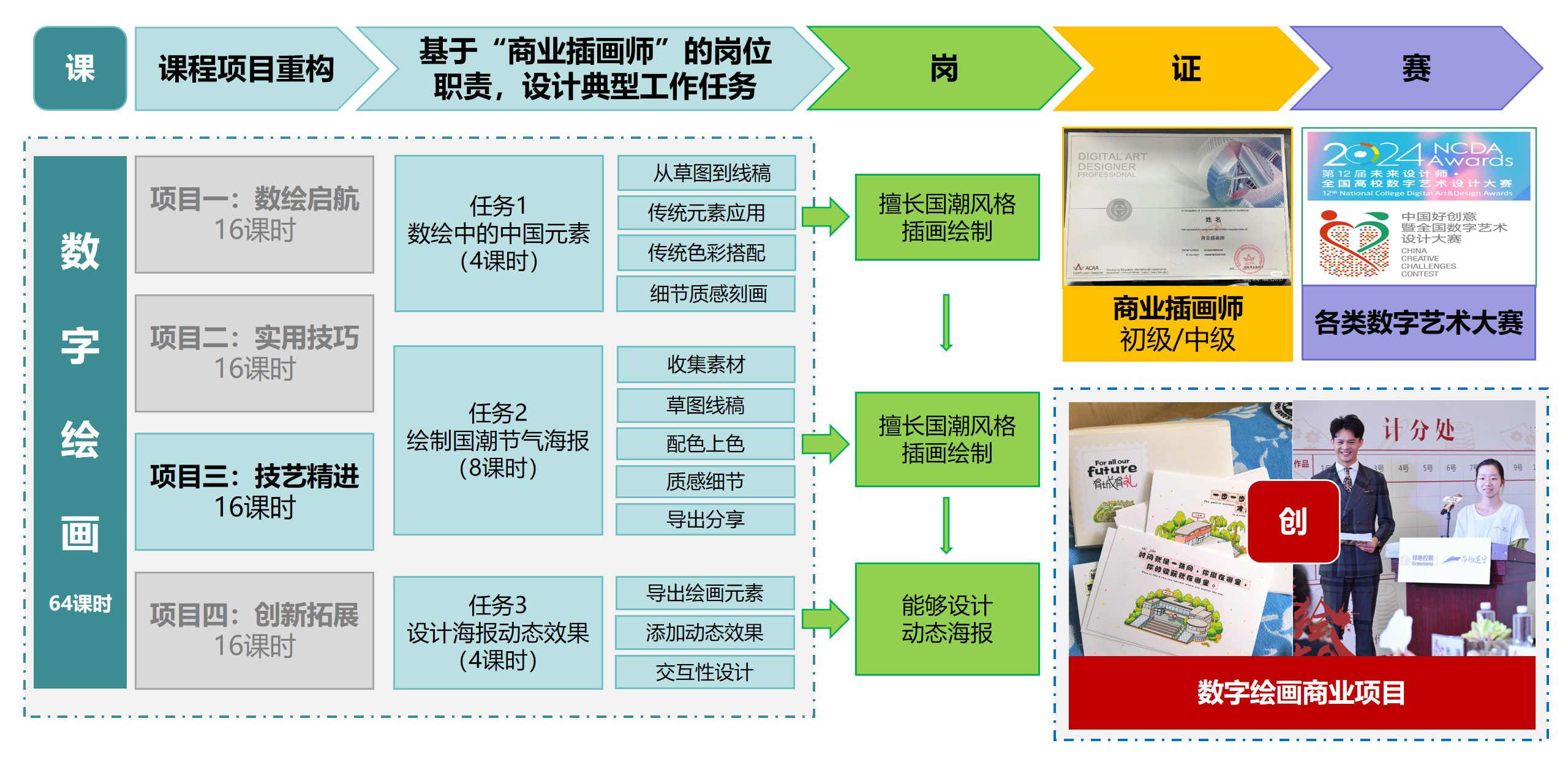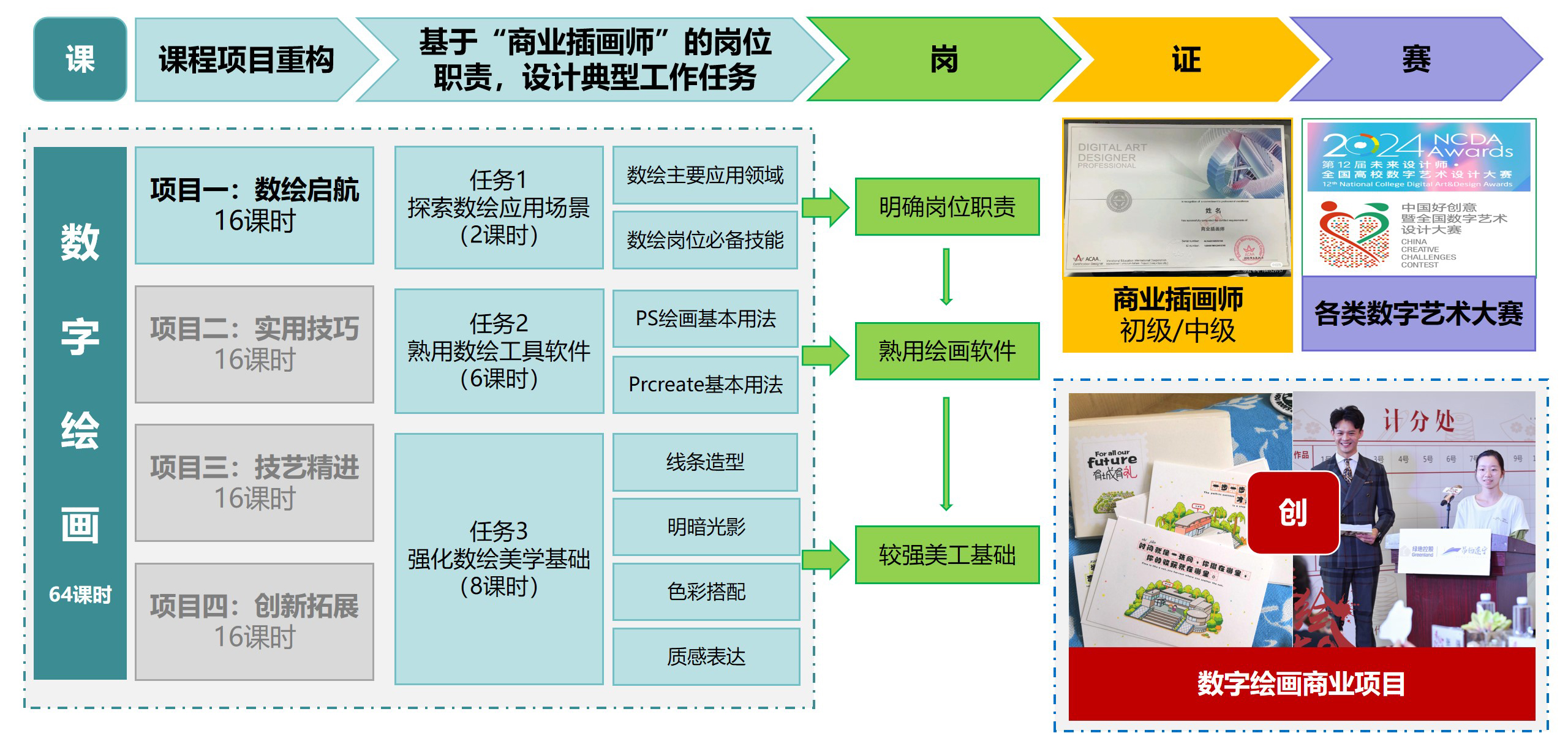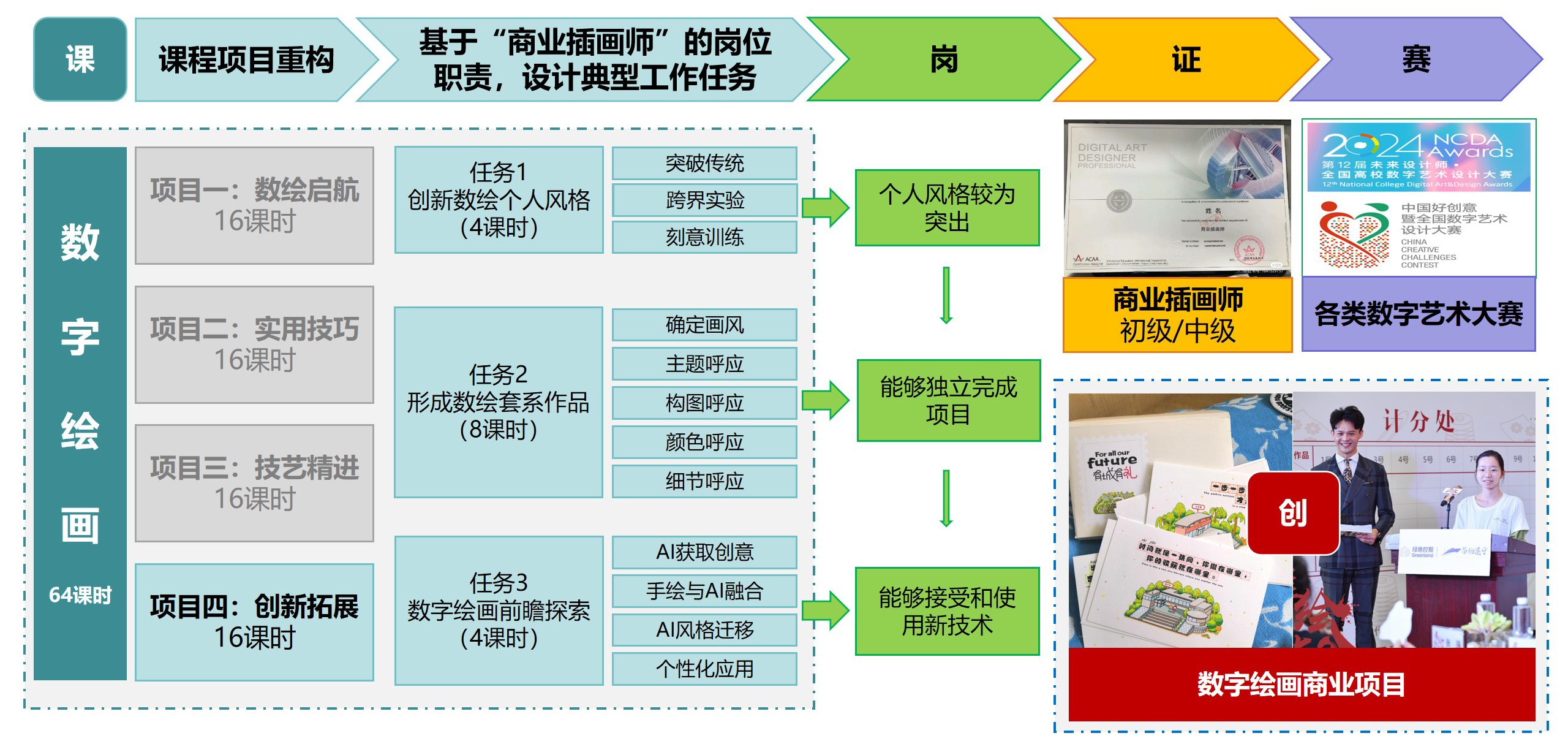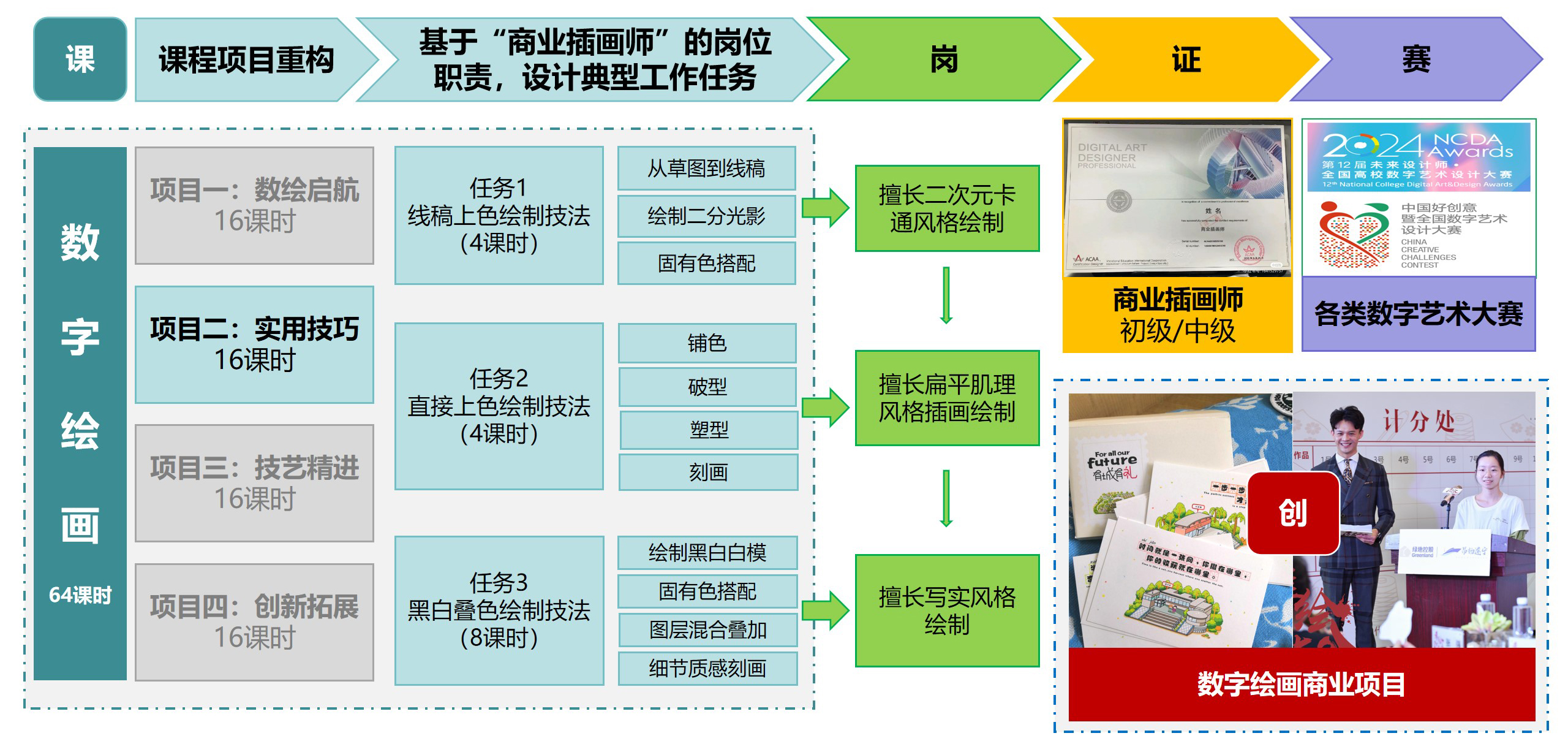 《数字绘画》课程秉承“课证融合、赛教融合、产教融合”的“三融合”理念,将课程分为“数绘启航、实用技巧、技艺精进、创新拓展”四个模块,通过难易阶梯推进的项目制教学,全方位培养学生的审美情感、提高学生的数绘技能、激发学生的创新能力,开启学生的数字绘画之旅。