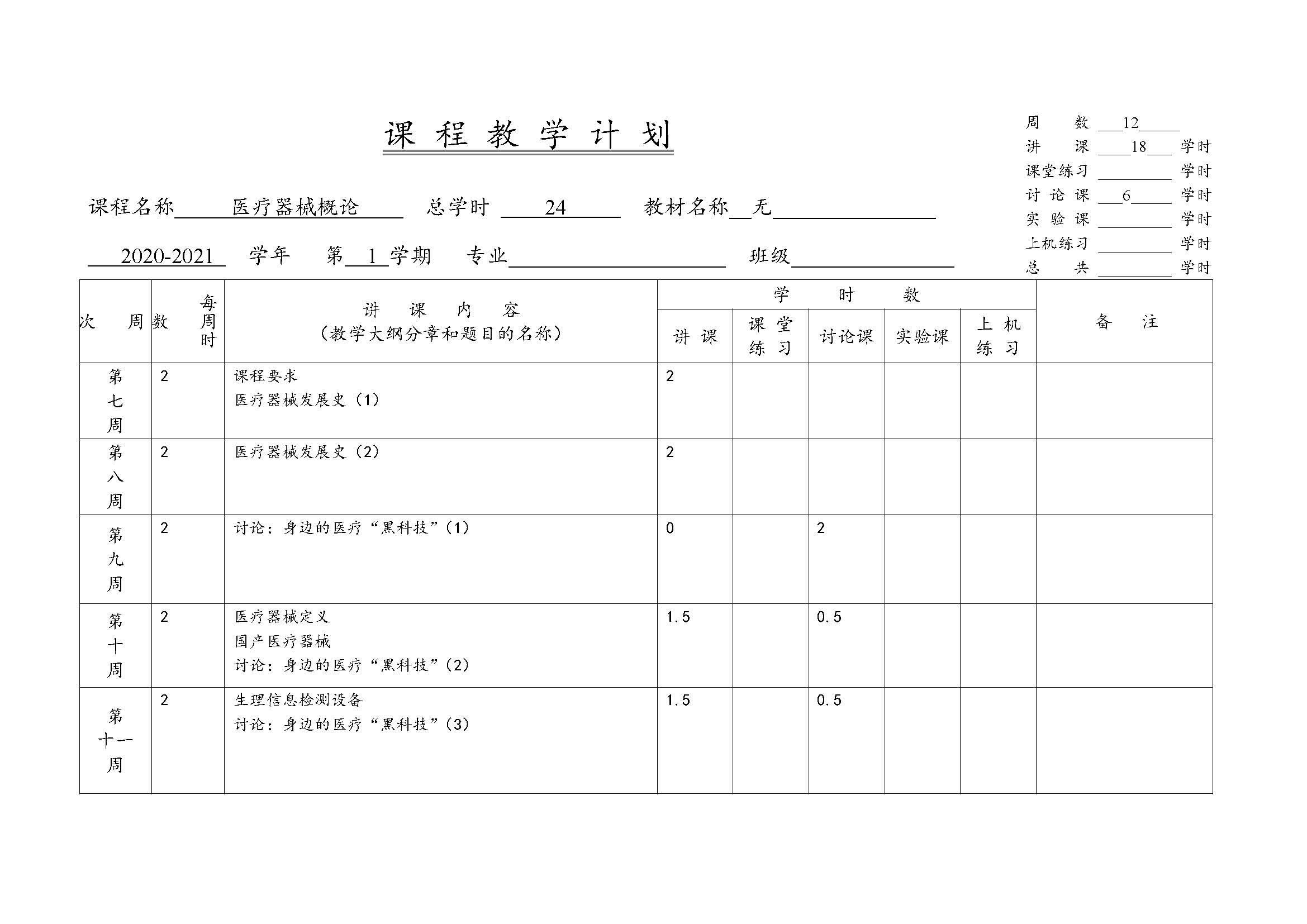 本课程详细介绍了医疗领域中正在使用的各类医疗器械,兼顾介绍日常领域常见的各类处于灰色地带的与人体健康相关的器械,同时介绍与航空、航天、民航等国防领域与人体信息检测相关的器械。根据本科生的特点,进一步介绍处于研究状态的高新医疗器械和最新医学诊断、检测方法。同时,结合生物医学工程的科研项目,阐述进行研发和研究医疗器械的路线及其特殊性。该课程是学生所在专业知识的有益补充,拓展了学生的学术和专业视野。 通过本课程学习,使学生了解各类医疗器械的设计思想、基本原理、实现方案以及所存在的种种问题。提高学生从各自专业角度思考和理解医疗器械的能力,从而激发学生从事研究医疗器械的热情。课程的学习,可以使得学生运用在各自领域所学习到的知识到医疗器械研发上,从而培养学生解决实际问题的技能。 (1)掌握医疗器械原理、分类等基本知识。 (2)掌握家用与人体健康相关的器械的基本原理与种类。 (3)掌握航空、航天、民航等国防领域人体信息检测设备。 (4)了解国产医疗设备及企业现状及发展。 (5)了解医疗器械的注册流程和特点。 (6)了解医疗器械科研开发思路和项目。