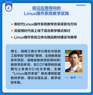 本课程是我校软件工程、计算机科学与技术、信息管理与信息系统3个国家一流专业建设点,数智、智媒体等多个院士卓越班,智能机器人、智能软件等多个特色微专业的专业共享课程。 本课程全程使用案例式教学,并主动将前沿技术融入Linux课堂教学。主要分为四个部分:Linux基础、系统管理、系统开发、前沿应用。具体内容包括Linux基础、图形界面基础、命令行基础、文件与目录管理、用户与组管理、磁盘存储管理、进程管理、软件包管理、Shell编程、C/C++编程,以及Linux在区块链、大数据、人工智能、docker容器等前沿场景中的应用。 本课程配套教材: 【1】张平, Ubuntu Linux操作系统案例教程,人民邮电出版社,2021,书号:978-7-115-57025-3 【2】张平, Linux操作系统案例教程(CentOS Stream 9/RHEL 9)(微课版),人民邮电出版社,2023,书号:978-7-115-61453-7