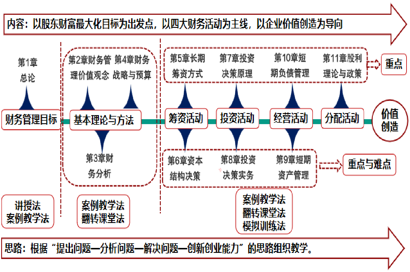 《财务管理》课程是我校财务管理专业必修课程,是《会计学》、《中级财务会计》等课程的延伸与深化、是《财务报表分析》、《财务管理信息化》、《审计学》等课程的基础与前提,在学科体系中居核心地位。《财务管理》课程主要以货币时间价值、财务分析及预算管理为理论基础,以企业财务活动为主线,重点讲授公司筹资方式与资本结构决策、投资决策、营运资金管理、股利理论与政策和公司并购重组等基本理论与方法。该课程内容体系包括理论和实践两个部分:理论部分12章内容,主要包括:(1)财管管理理论基础,包括:财务管理价值观念、财务分析、财务战略与预算。该部分为筹资决策、投资决策、经营决策及分配决策等内容学习奠定理论基础;(2)筹资决策与分析,包括:长期筹资方式、资本结构决策;(3)投资决策与分析,包括:投资决策原理、投资决策实务;(4)营运管理决策与分析,有短期资产管理、短期筹资管理;(5)分配决策与分析,主要讲股利理论与政策。理论部分是财务管理课程的主体,也是学习的重点与难点。实践部分,主要根据所学的理论知识,针对性进行实训实践活动,以提高学生分析问题、解决问题的能力。(1)利用课内实验时间,对上市公司财务管理状况进行案例讨论分析,以评价其资金管理的状况;(2)利用智慧教室、实验室等条件进行实务演练、智能财税实验、沙盘模拟实验等,以加强学生实践能力的培养;(3)带领学生参加企业的财务管理实践活动,使学生体验财务管理的无穷魅力。实践部分是培养学生创新创业能力的重要环节。