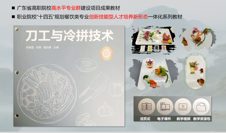 教材包含刀工基础(7 个项目、25 个任务)和冷拼艺术(2 个项目、22 个任务)两大模块,采用创新多样的活页式、融媒体形式,汇集行业大师与骨干教师智慧,图文并茂且融入多媒体元素,扫描二维码即可观看制作流程,便于学习。