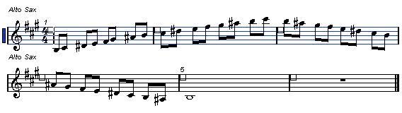 乐曲的调性布局的情况是变化多端的,不存在某种固定不变的模式。但是,调性布局通常还是有一定规律可循的。这种规律可用一个简单的公式来表示:T(主调)——D(属方向调)——S(下属方向调)——T(主调)。当然,在具体的作品中,调性布局并不总是如此简单,而往往是比较曲折的,但总的框架大致会符合这一规律。下面这个例子,可以看作是这一调性布局公式的最直接明确的体现:这是贝多芬《月光》奏鸣曲第二乐章开始部分的主题乐段。这一乐段可分上下两句,每句各有两个乐节。四个乐节分别在不同的调性上,布局恰好是T-D-S-T。这个例子可以看成是调性布局规律的缩影。这种布局的合理性在于往属方向(D)的转调具有对主要调性强烈的离心倾向,而下属方向(S)调性的出现则具有向主要调性能够回归的趋势,给主掉的重建以支持。