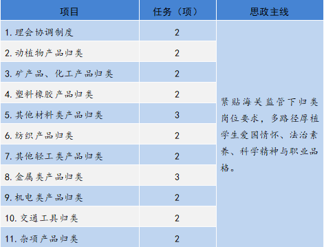 【课程内容】基于知识型技能学习特点,在世界海关组织《商品名称及编码协调制度》21类97章分类目录基础上,结合我国进出口商品主要特点(类别、贸易量),先总后分,有详有略,整合序化形成11个项目24项工作任务。