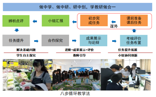 通过阶梯式学习目标,问题引领,形成“初探-提升-拓展”的教学整体架构设计,及课前准备(课后任务)—初步完成任务—小组汇报—辨析点评—任务提升—合作探究—成果展示与论辩—考核评价(任务布置)的“循环递进式”教学策略。“课前、课中、课后”贯通实施,“学教研做合一”贯穿始终。