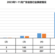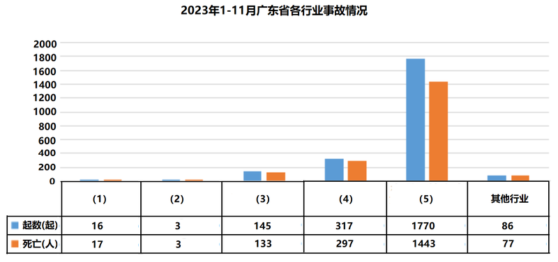 2023年广东省安全生产按农林牧渔业、采矿业、商贸制造业、建筑业、交通运输和仓储业、其他行业共6个行业统计的所发生的事故起数和死亡人数,见附图。其中不属于“农林牧渔业、采矿业、商贸制造业、建筑业、交通运输和仓储业”的都列为“其他行业”。其中其他行业1-11月共发生事故86起,造成77人死亡。请你将(